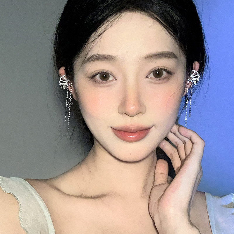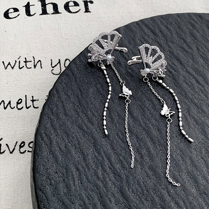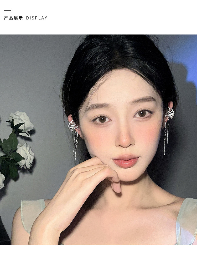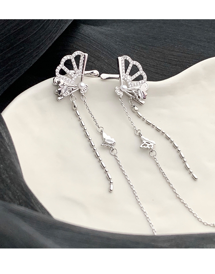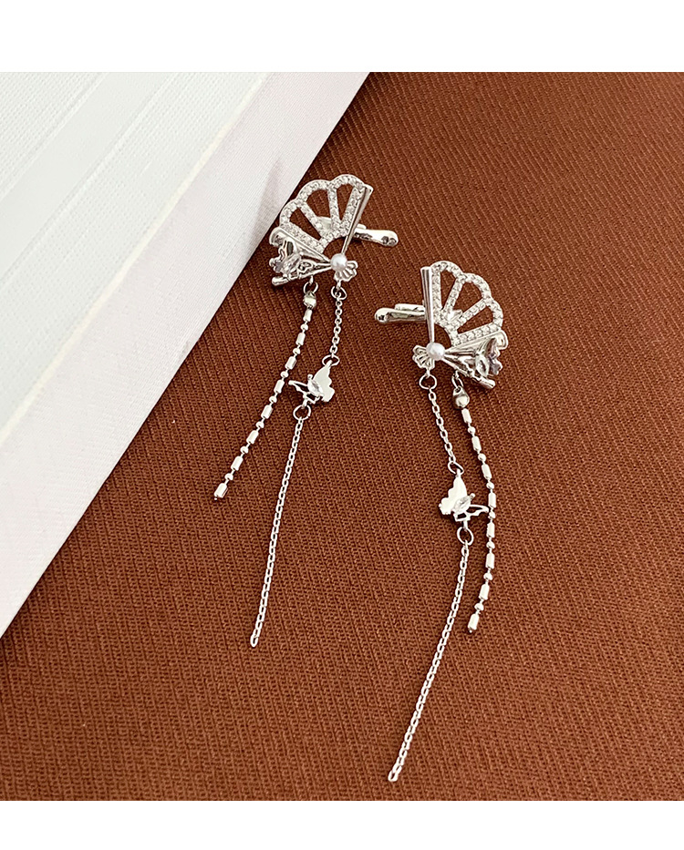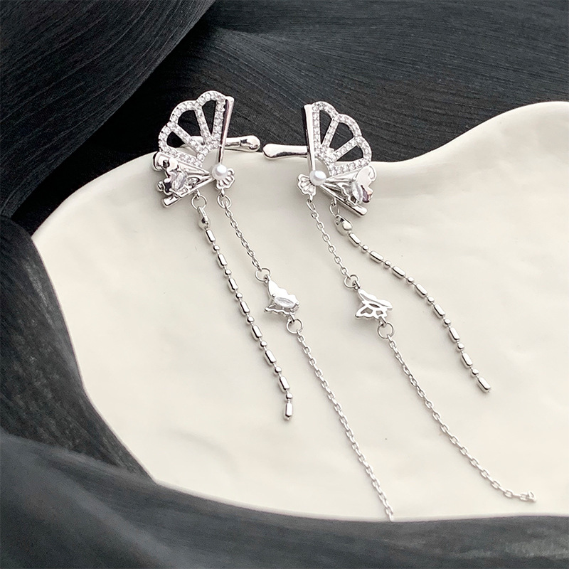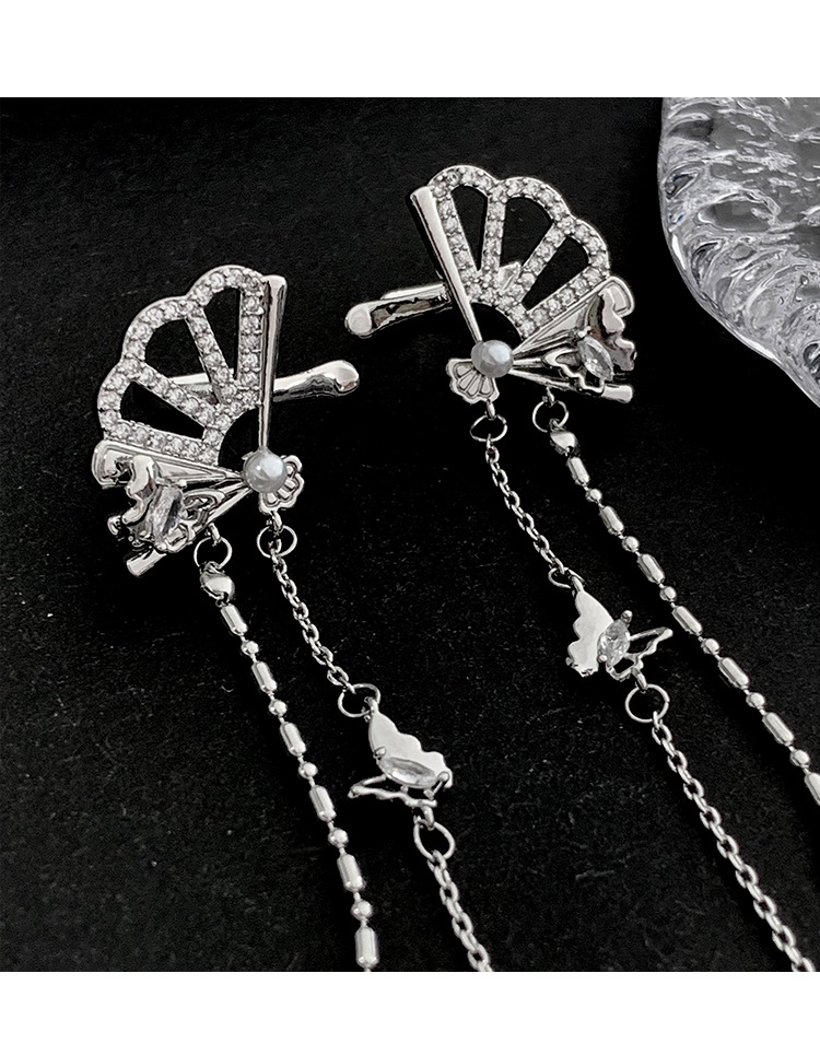 新中式国风扇子长款蝴蝶流苏耳夹无耳洞耳骨夹小众设计感镶钻耳饰