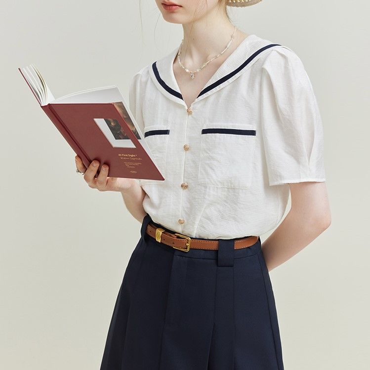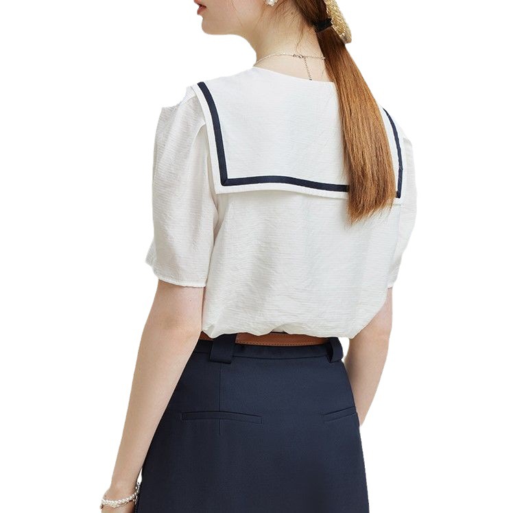 法式短袖衬衫女早秋新款海军领休闲上衣