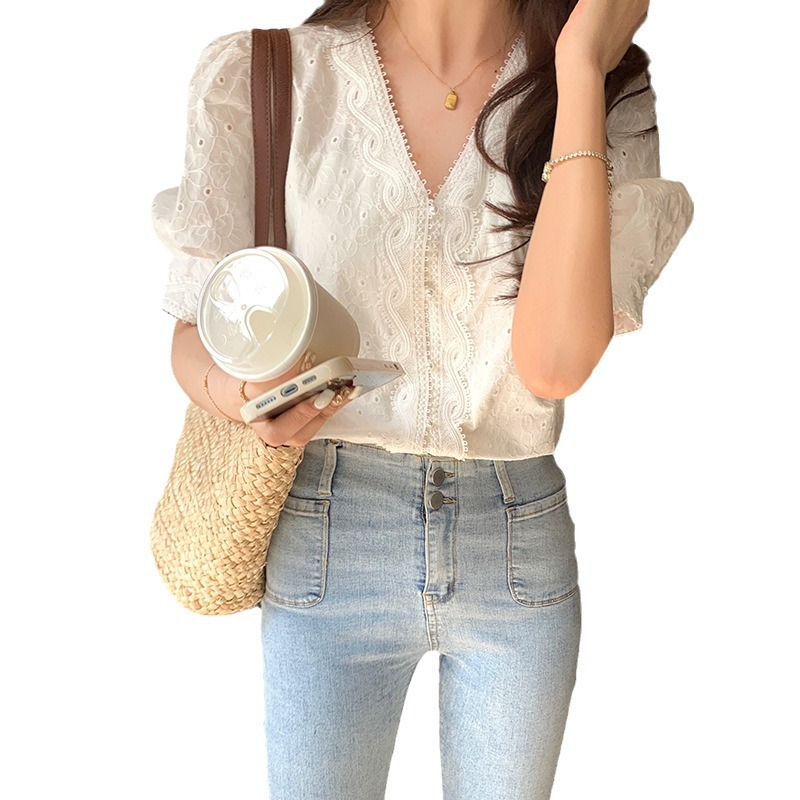 韩版百搭V领刺绣短袖衬衫女上衣夏季新款小众百搭