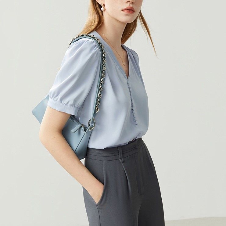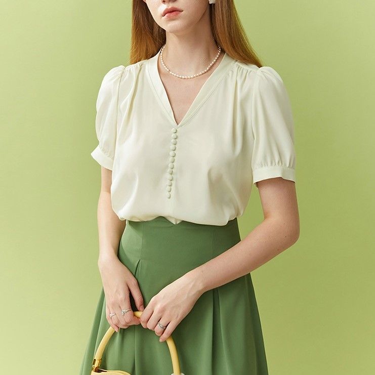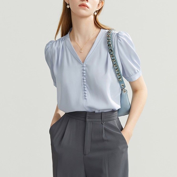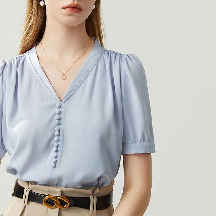 高级质感夏女新款V领短袖衬衫小众时尚薄款气质职业上衣