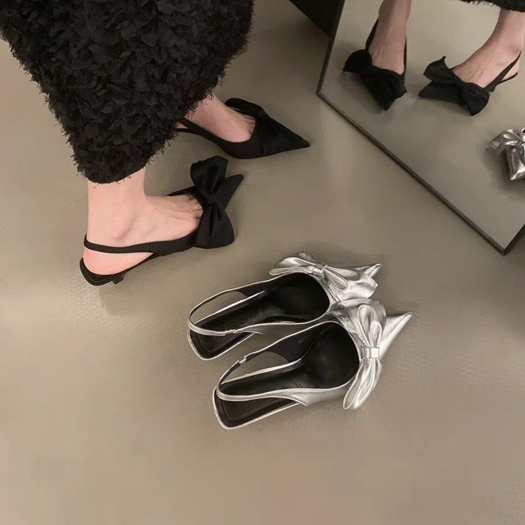 银色尖头细高跟凉鞋女新款蝴蝶结包头凉鞋高级感气质黑色单鞋