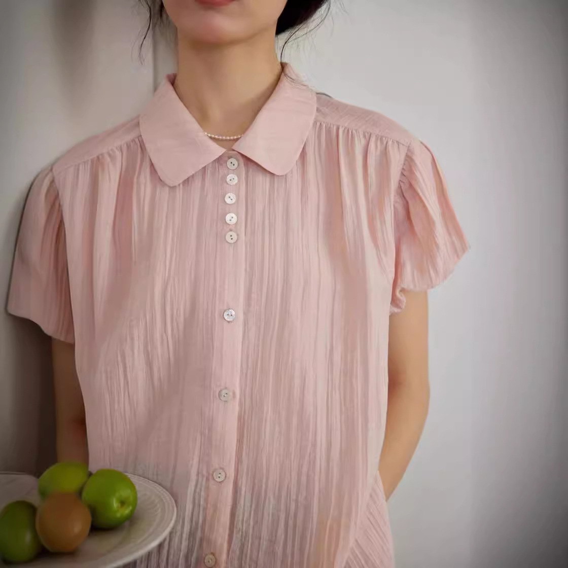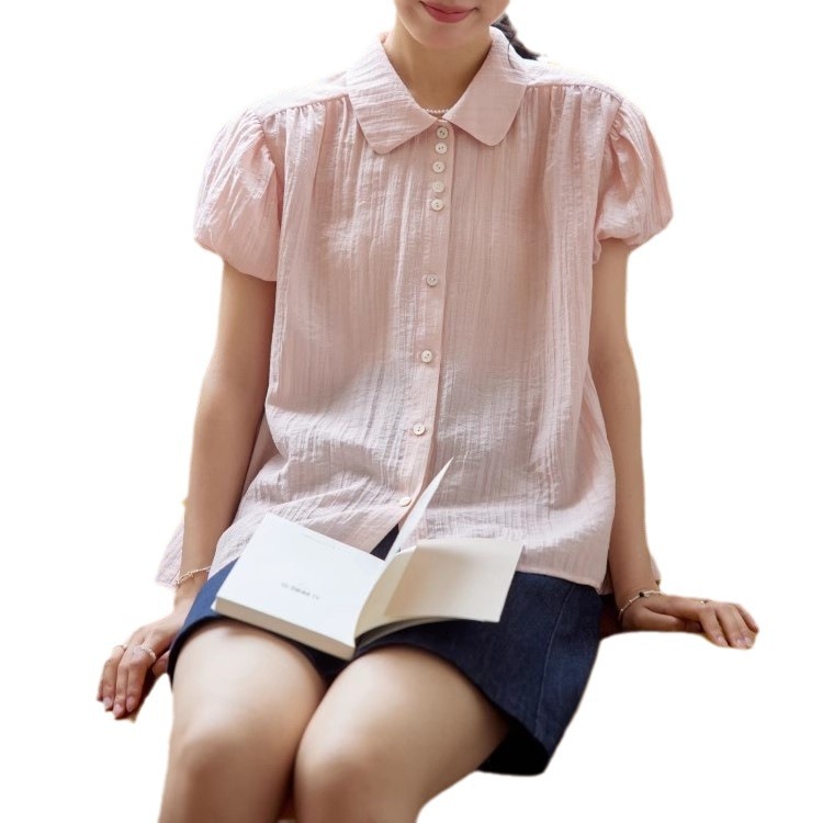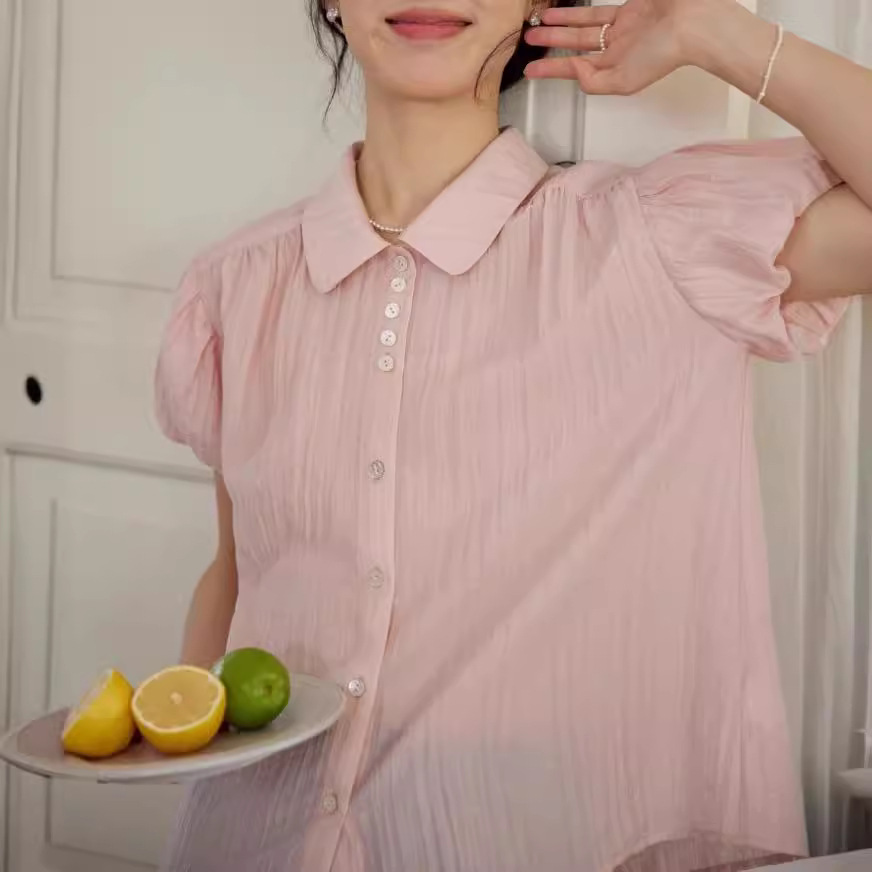 短袖衬衫女夏季新款法式小众荷叶边泡泡袖刺绣上衣