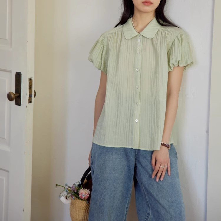 天丝衬衫女夏季新款轻薄小众气质垂感小翻领花苞袖绿色上衣
