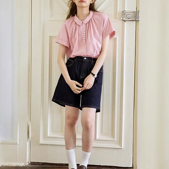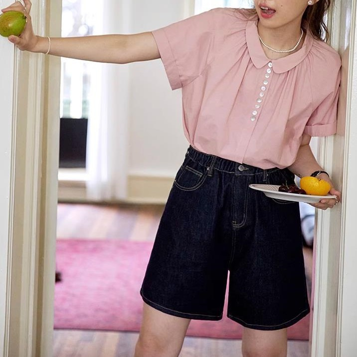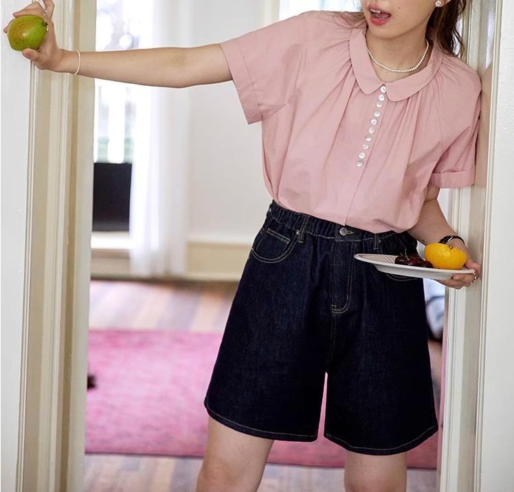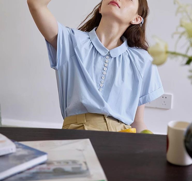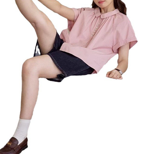 法式复古娃娃领贝壳扣设计感衬衫夏季新款显瘦短袖衬衫女