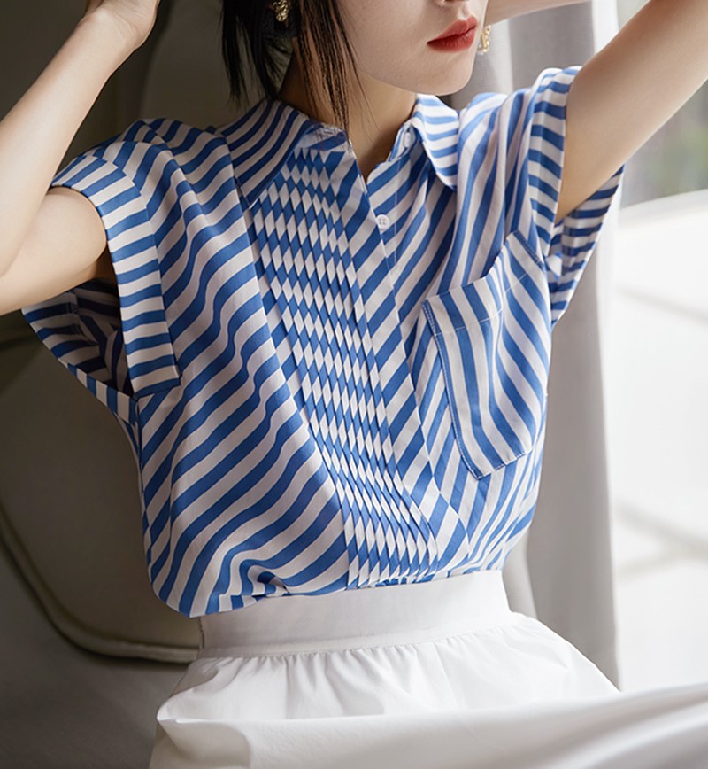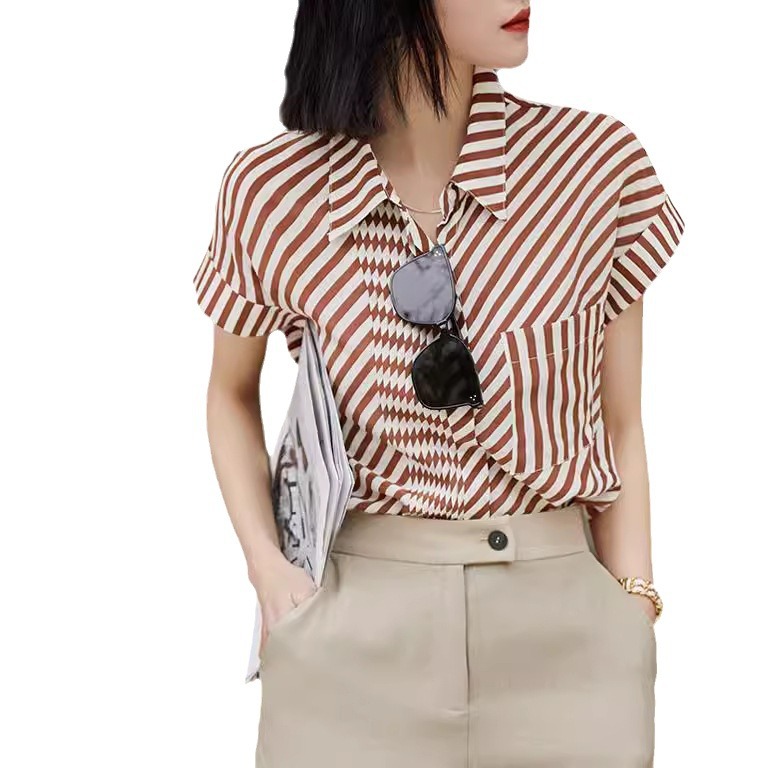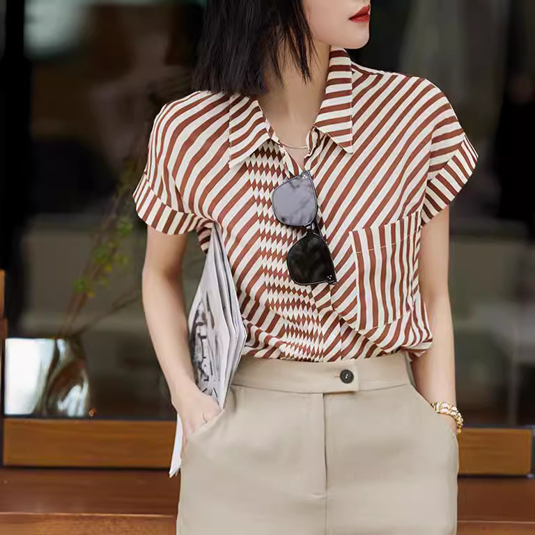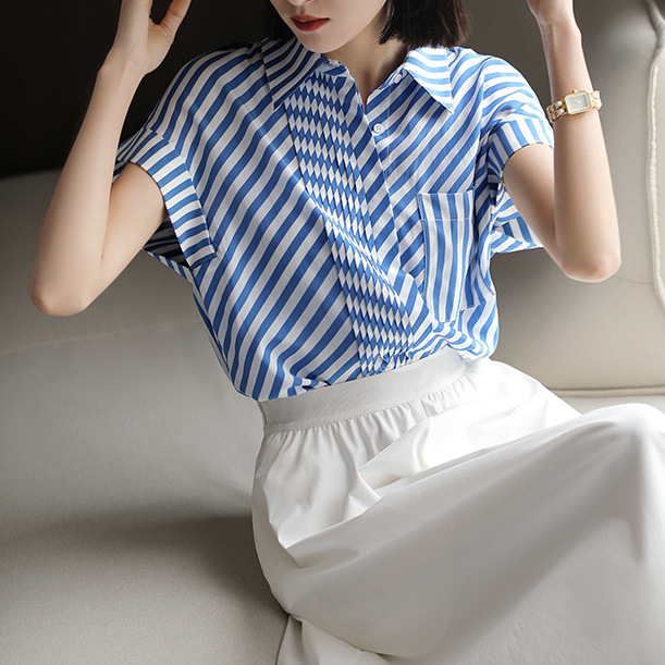 真丝手工缝线压折不对称微盖袖条纹女夏季百搭条纹衬衫气质上衣