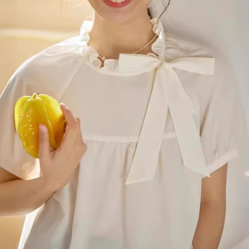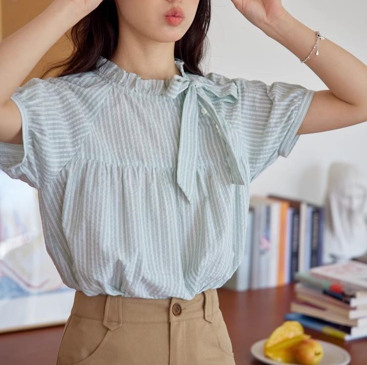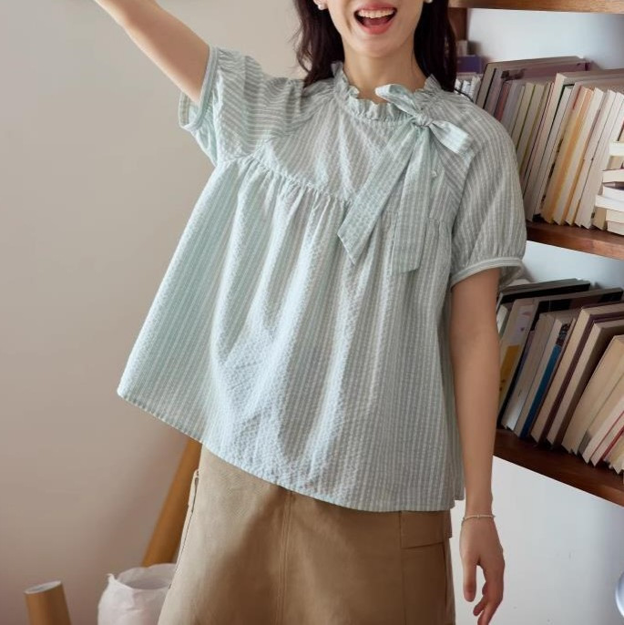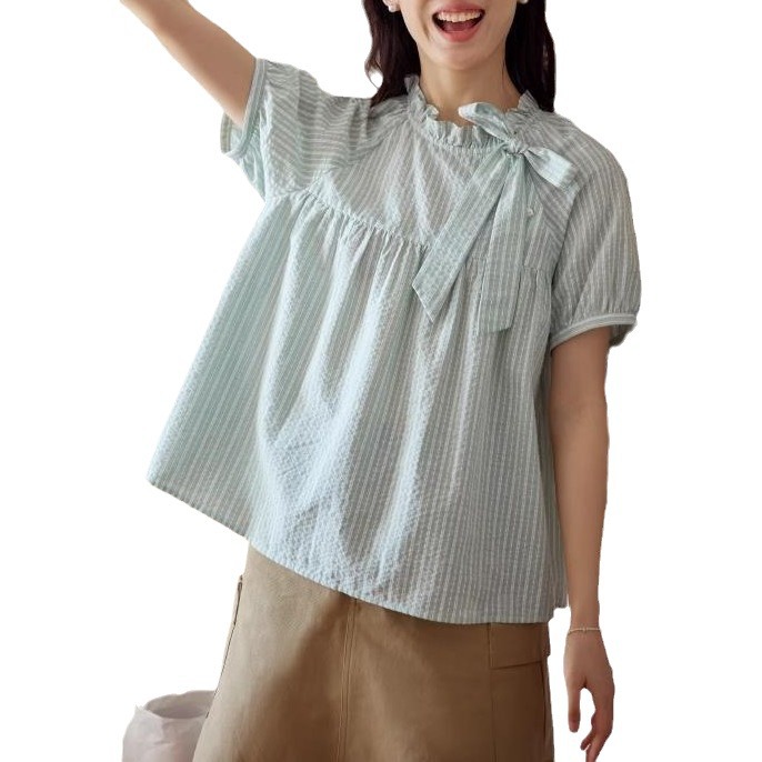 绿色条纹衬衫女夏季法式温柔风木耳边设计感宽松小衫