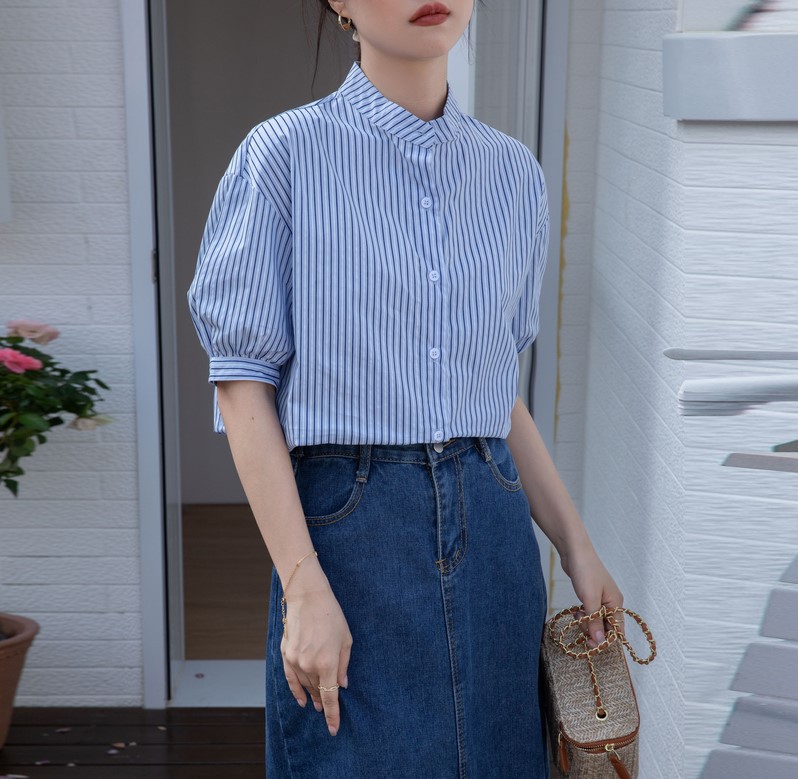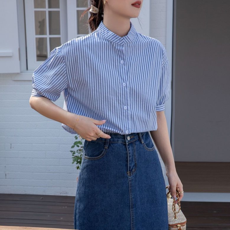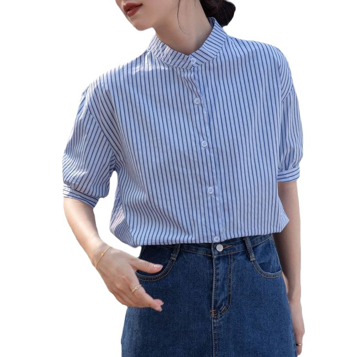 蓝色条纹夏设计感百搭宽松显瘦衬衣通勤衬衫女短袖经典衬衫女