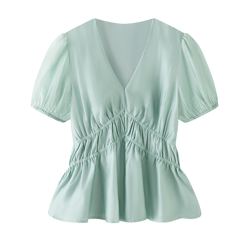 年夏季新款纯色短袖轻熟风气质V领泡泡袖罩衫衬衫女