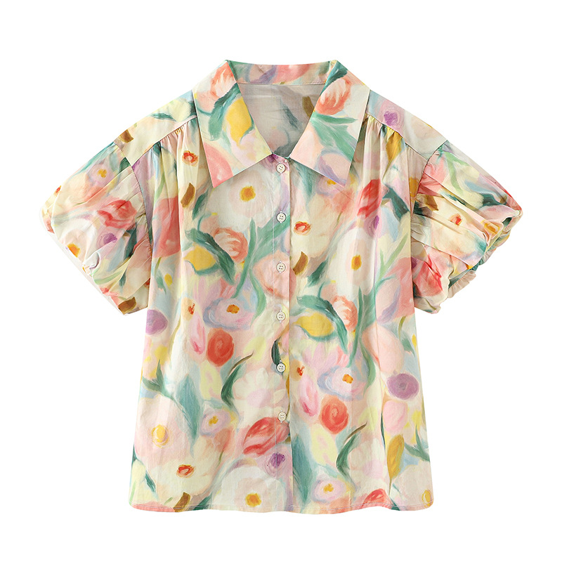 法式复古油画印花衬衫女夏季新款女装宽松短袖衬衣上衣女