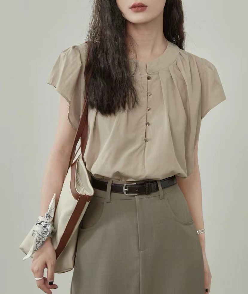 「凉感莫代尔Modal^柔软亲肤」圆领衬衫女小众短袖上衣