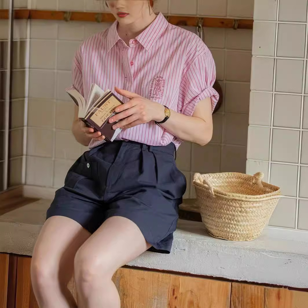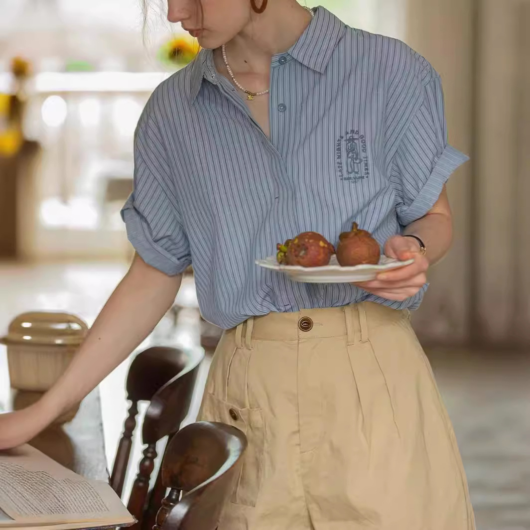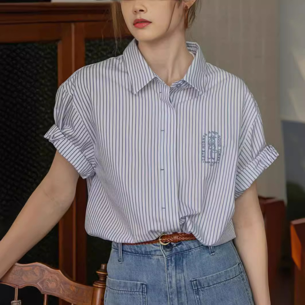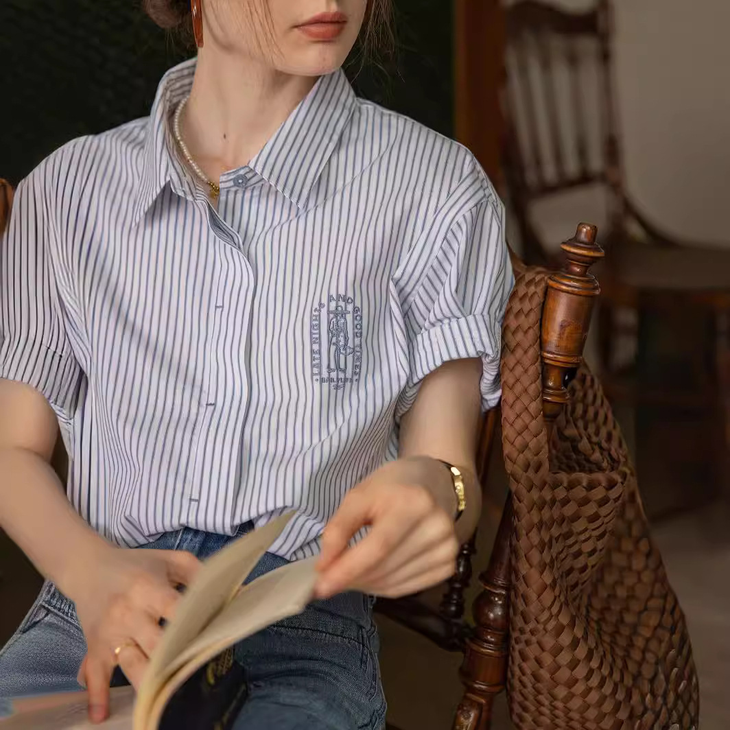 Dailyart法式蓝色衬衣上衣女夏复古刺绣休闲百搭短袖条纹春日衬衫