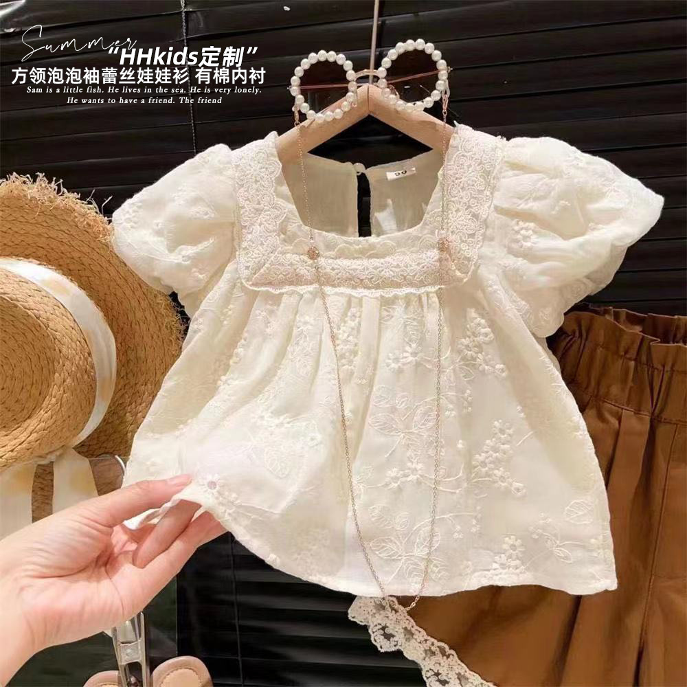 新品方领泡泡袖刺绣娃娃衫牛仔裤两件套2025夏装女童上衣娃娃套装