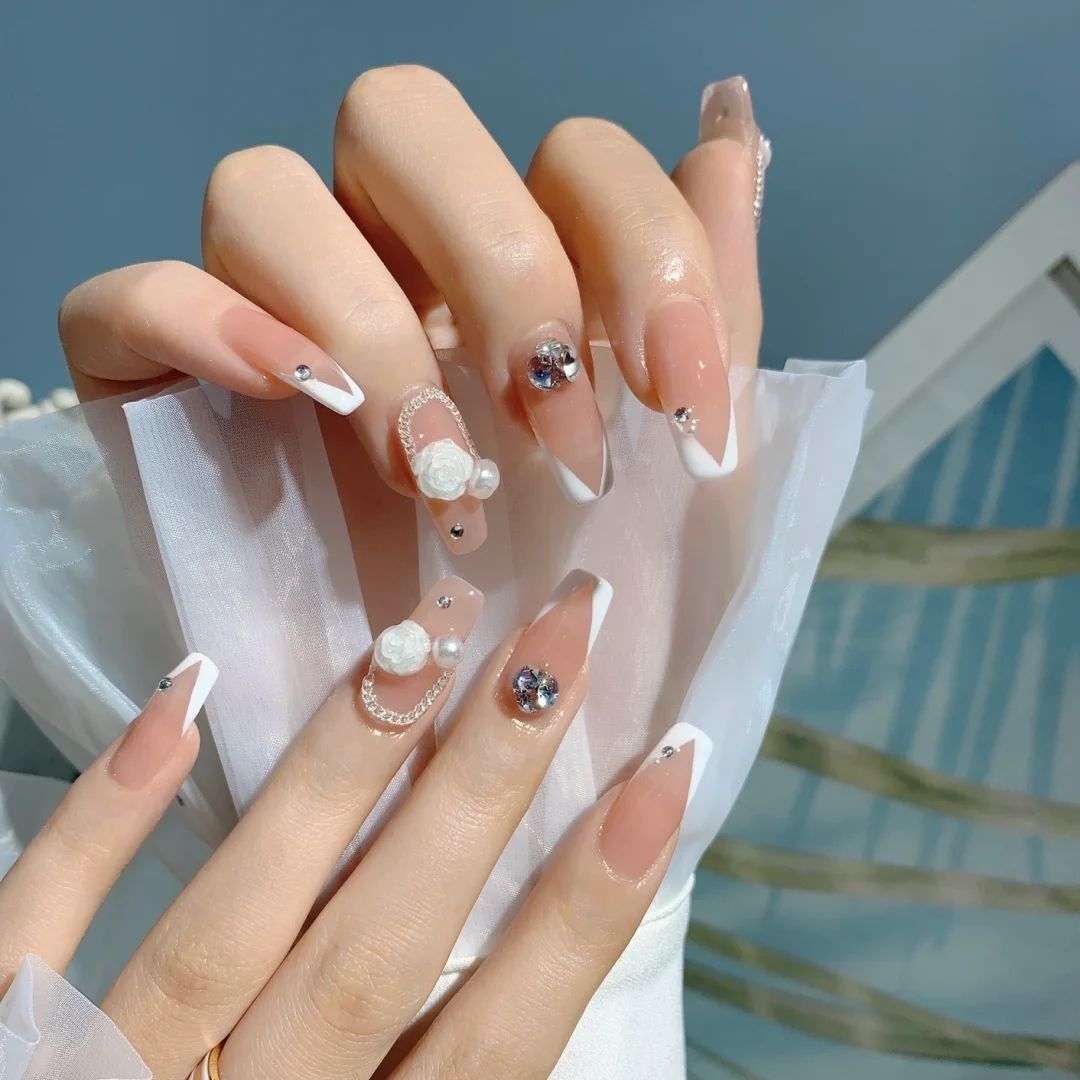 纯手工光疗穿戴甲 法式白玫瑰穿戴甲批发成品重复使用美甲贴片