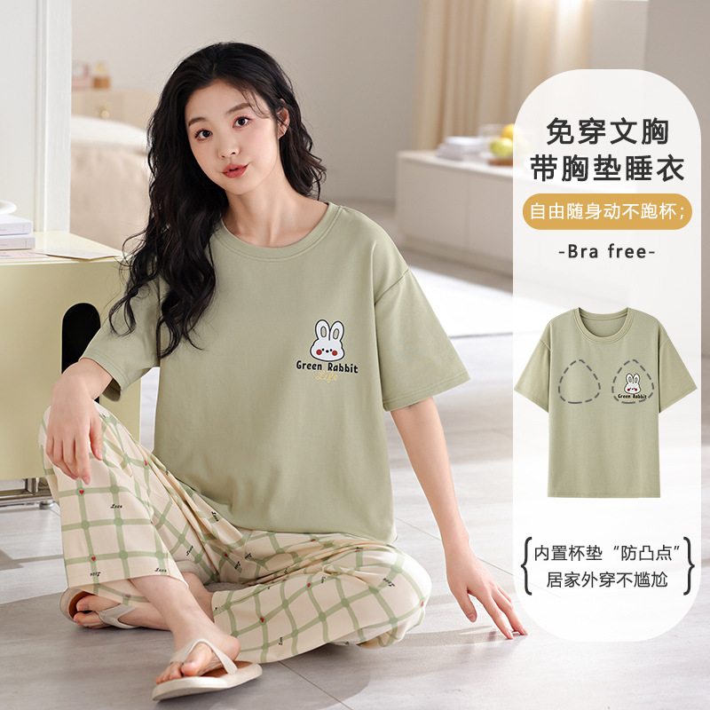 自带胸垫睡衣女夏季纯棉短袖长裤大码宽松外穿全棉夏天家居服套装