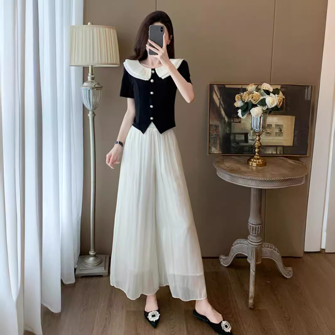 夏季新款轻熟风时尚减龄套装女显瘦娃娃领上衣阔腿裙裤两件套