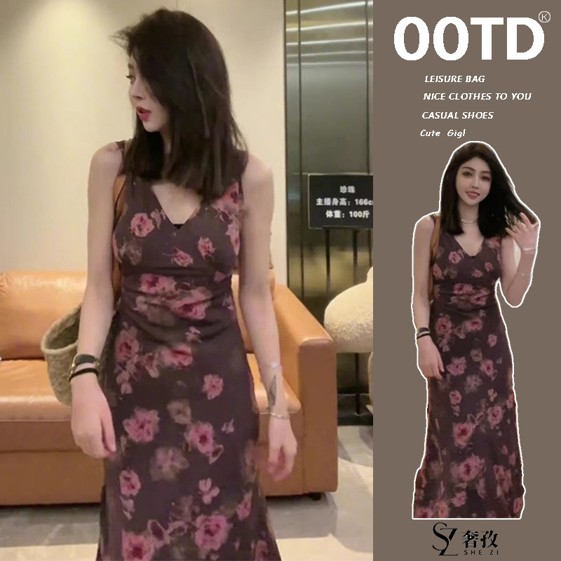 法式复古碎花连衣裙女夏季新款设计感无袖气质高腰显瘦鱼尾长裙子