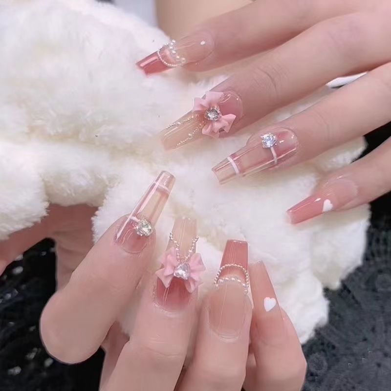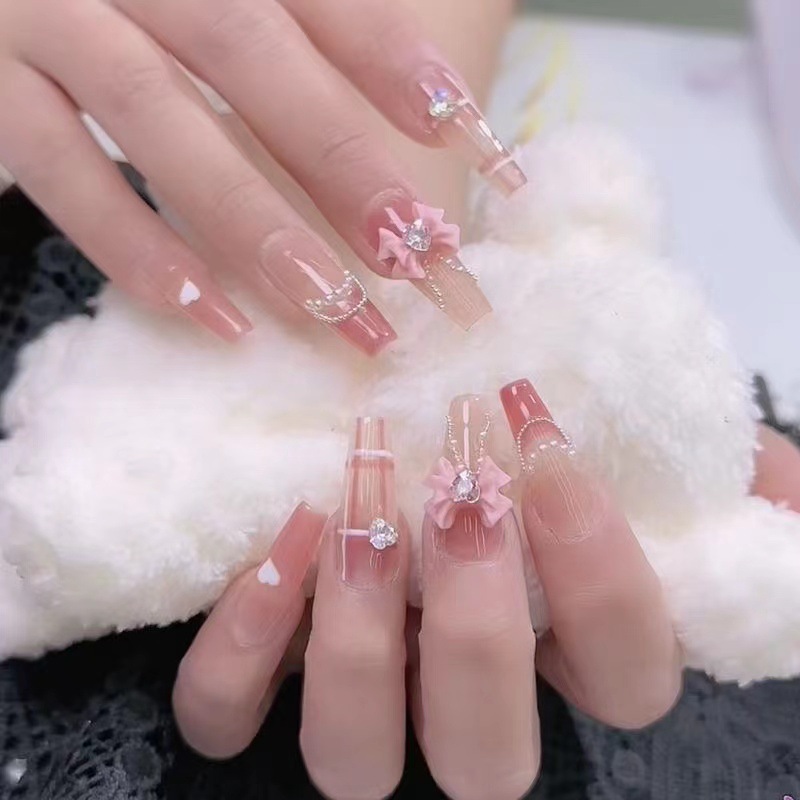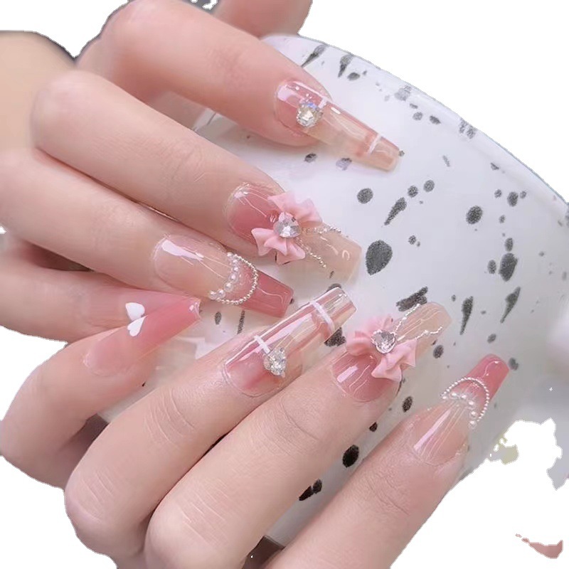 纯手工光疗穿戴甲粉红格纹穿戴甲批发成品重复使用美甲贴片可拆卸