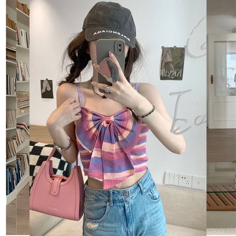 法式辣妹装小吊带背心女夏季别致条纹木耳边外穿无袖短款针织上衣