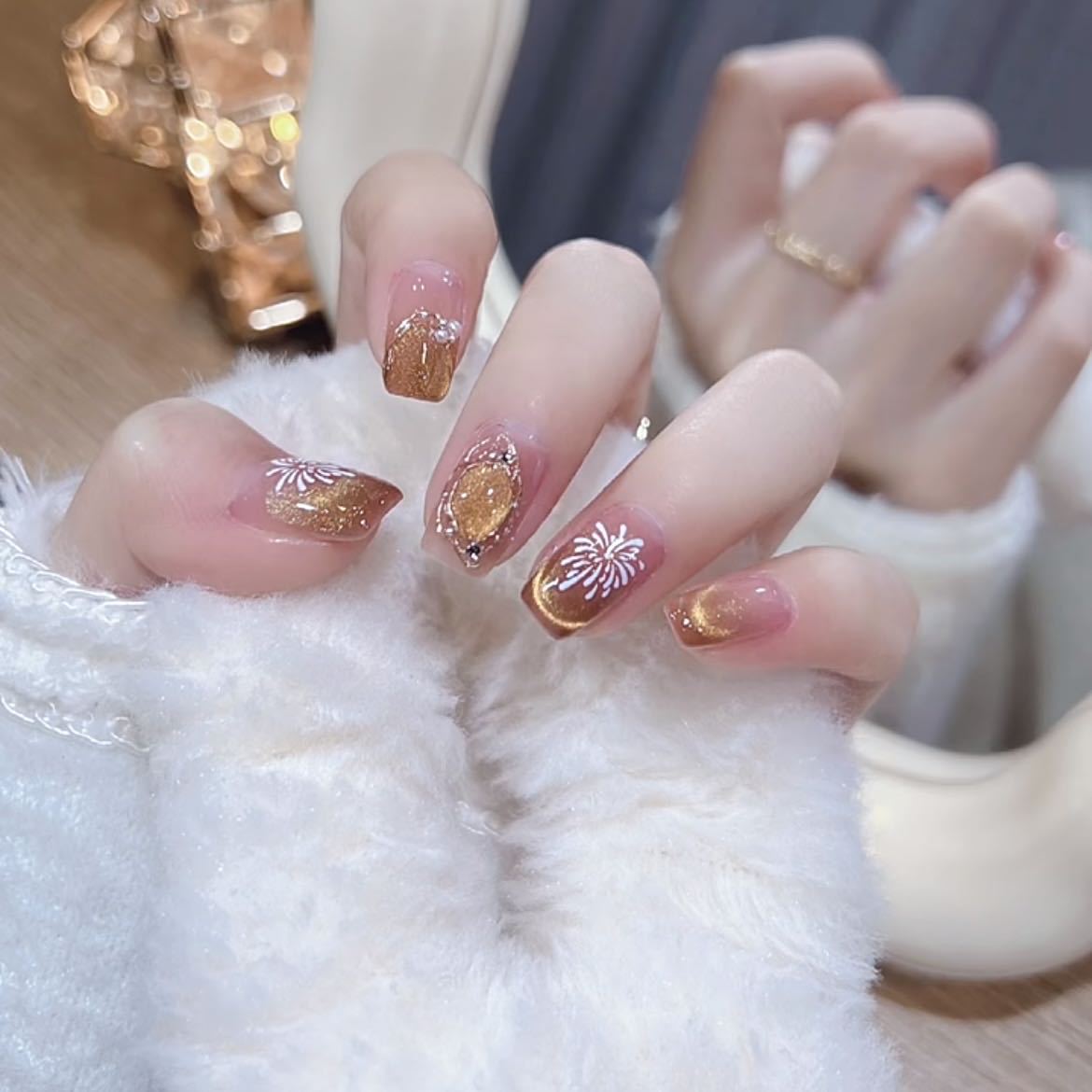 纯手工光疗美甲烟花金色猫眼穿戴甲批发成品重复使用美甲贴片可拆