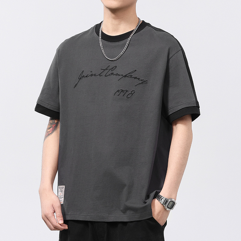 拼接撞色纯棉T恤男美式复古短袖夏季230g新款潮牌刺绣宽松上衣男