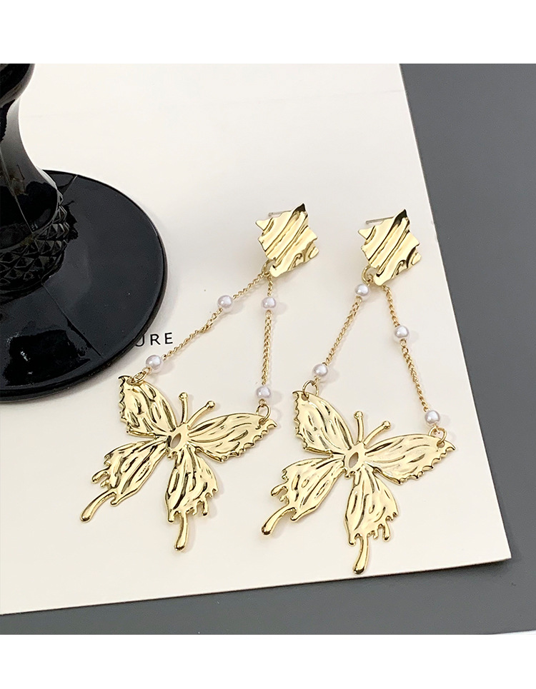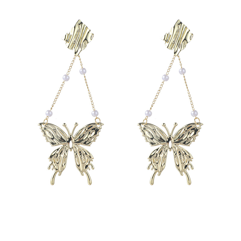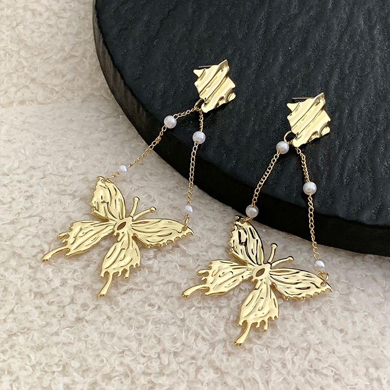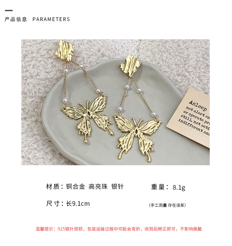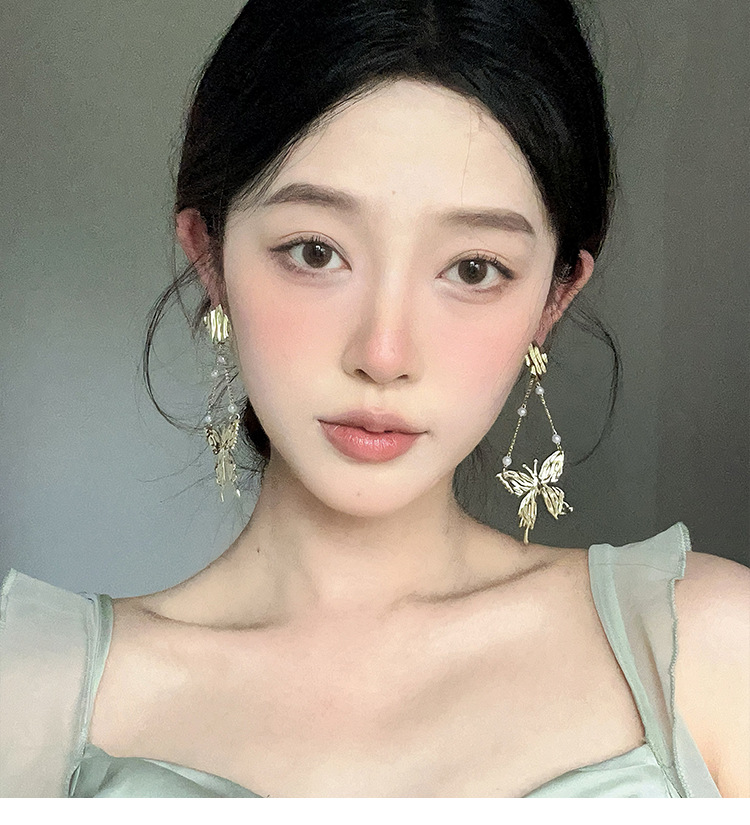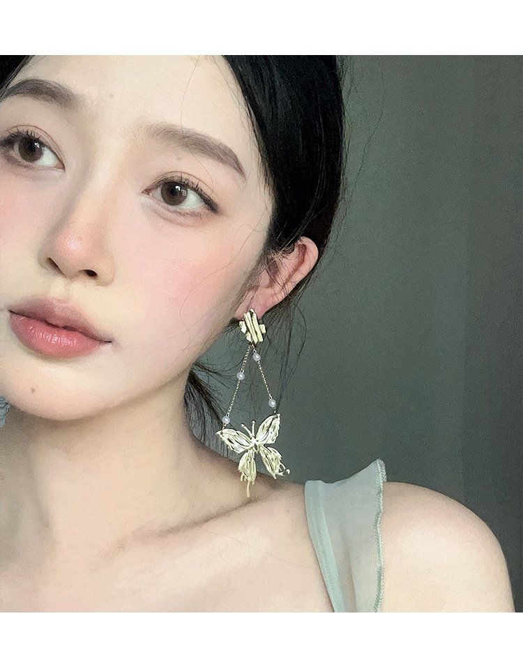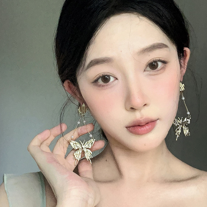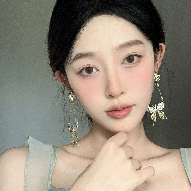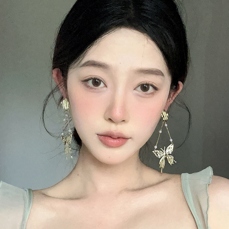 气质夸张蝴蝶珍珠耳环轻奢高级感小众设计感耳坠气质长款流苏耳饰