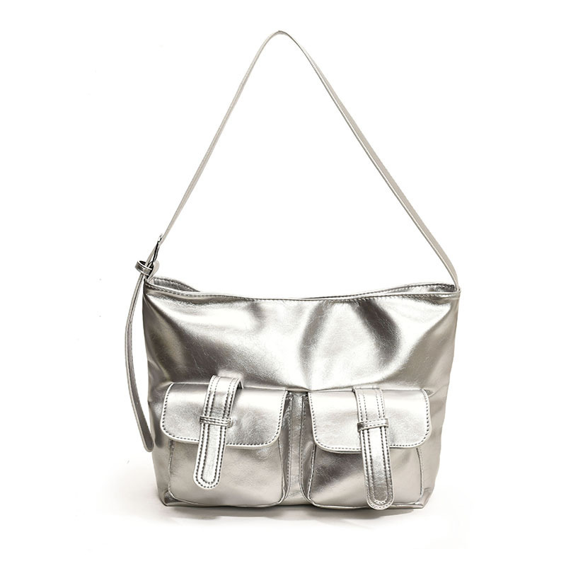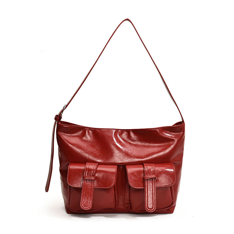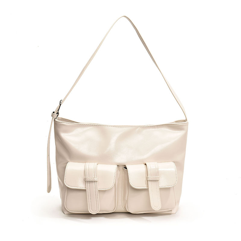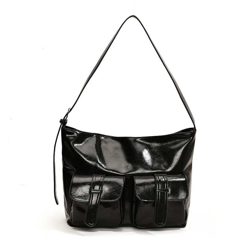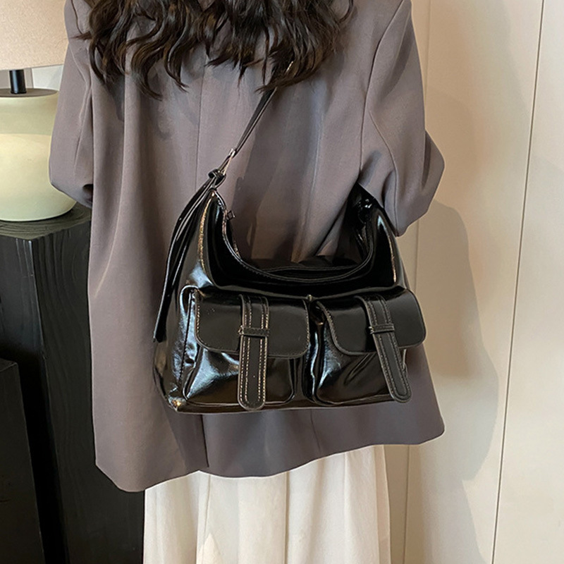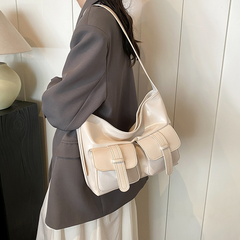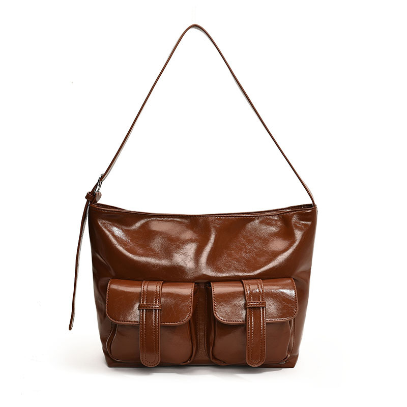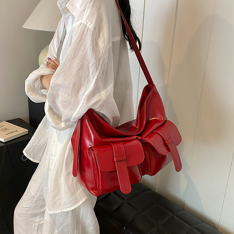 小众休闲软皮机车多口袋大容量单肩斜挎托特包潮初秋新款