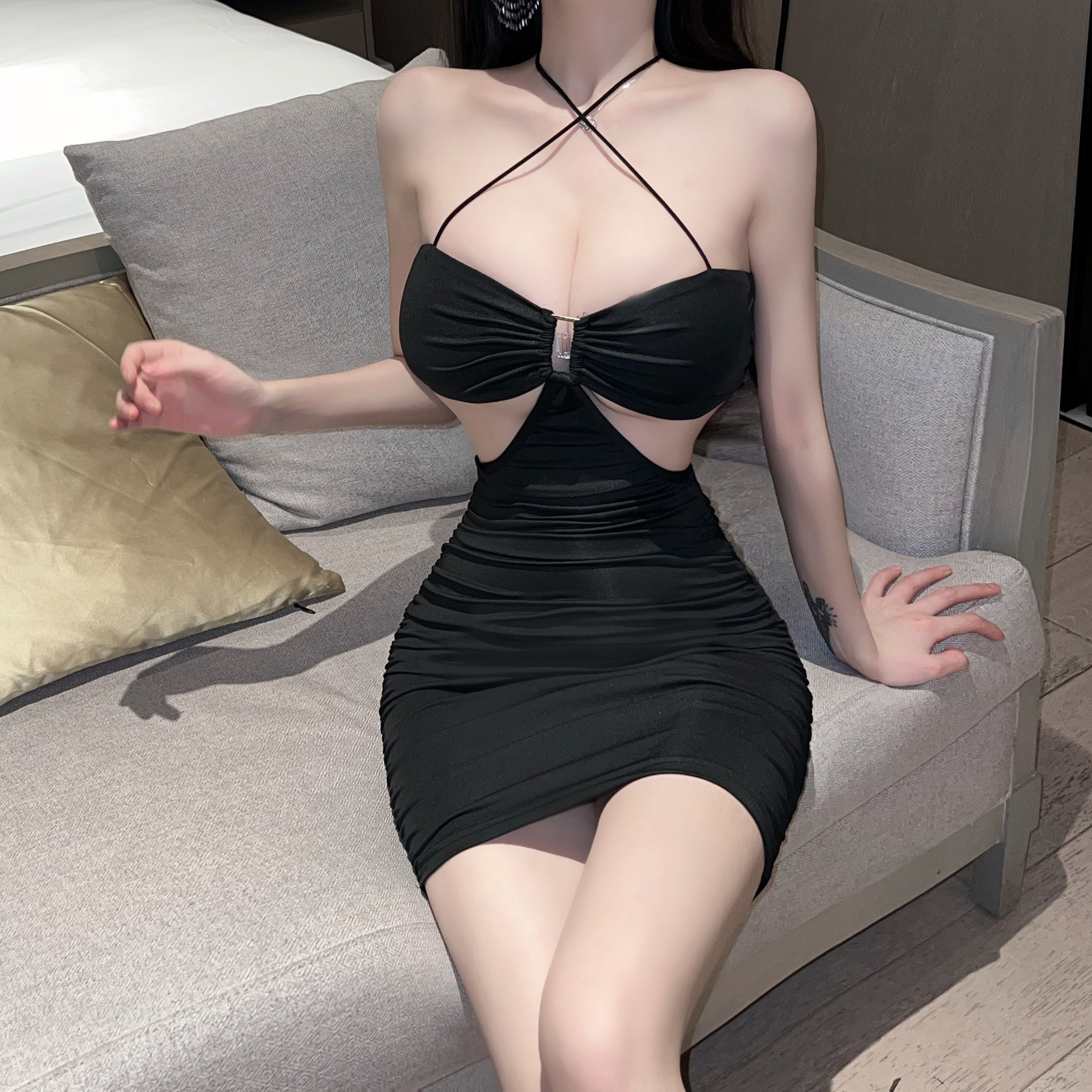 性感夜店辣妹低胸镂空挂脖露背紧身包臀连衣裙女