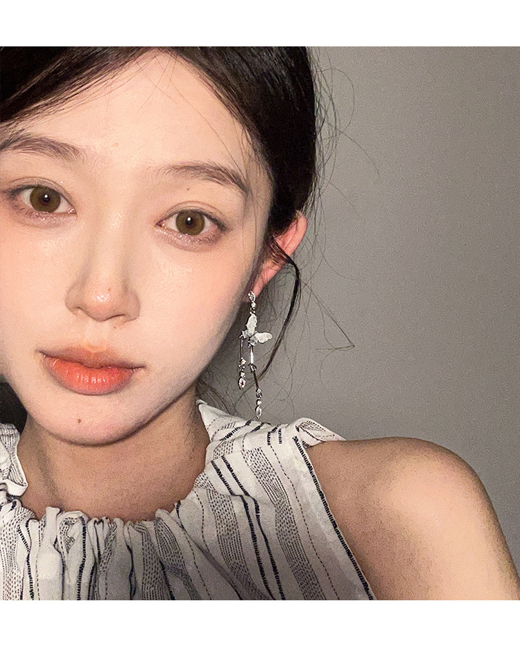 清冷蓝色水晶蝴蝶流苏耳环气质高级感长款耳坠年新款百搭耳饰