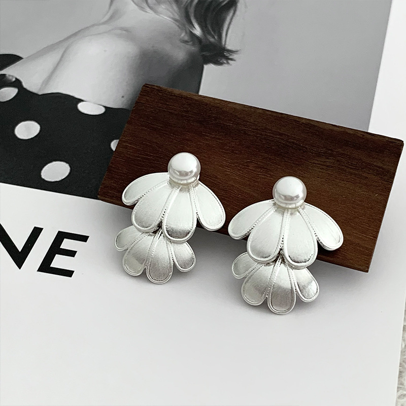 新中式国风拉丝花瓣珍珠耳环气质小众独特金属耳钉年新款耳饰
