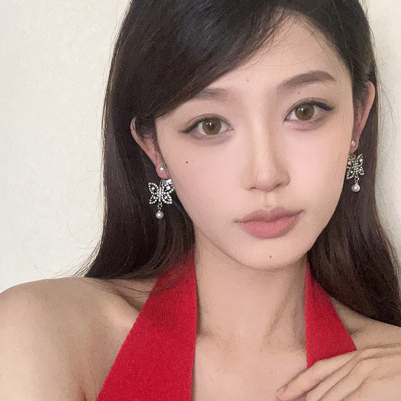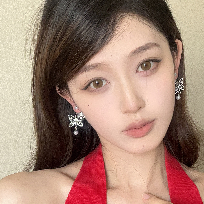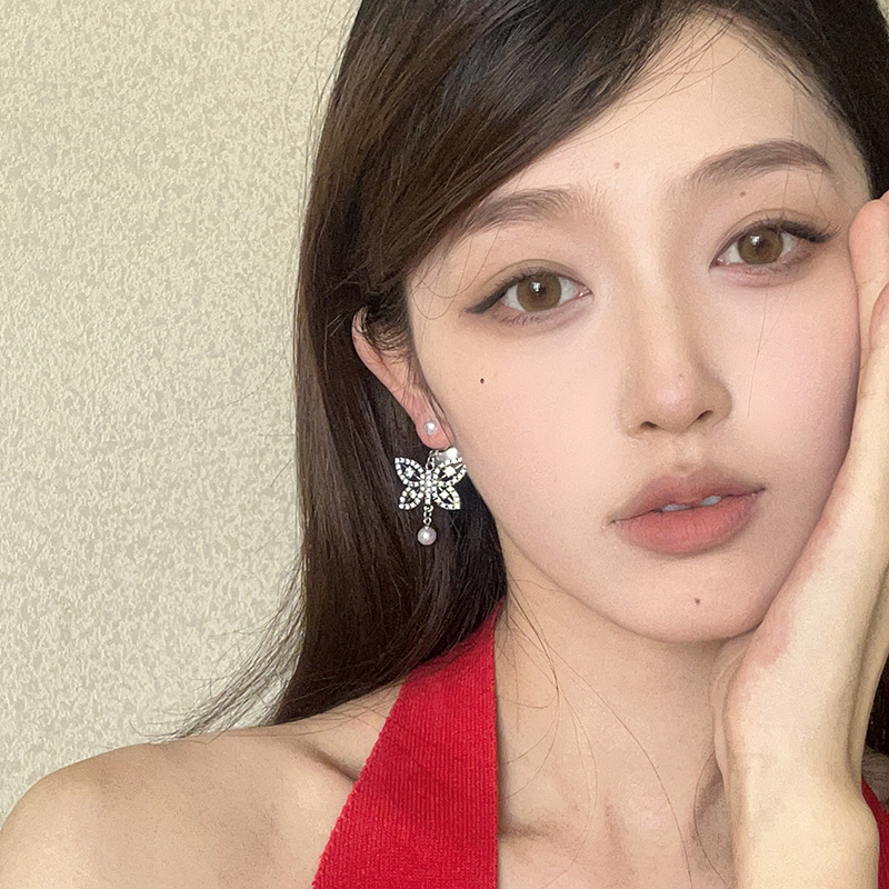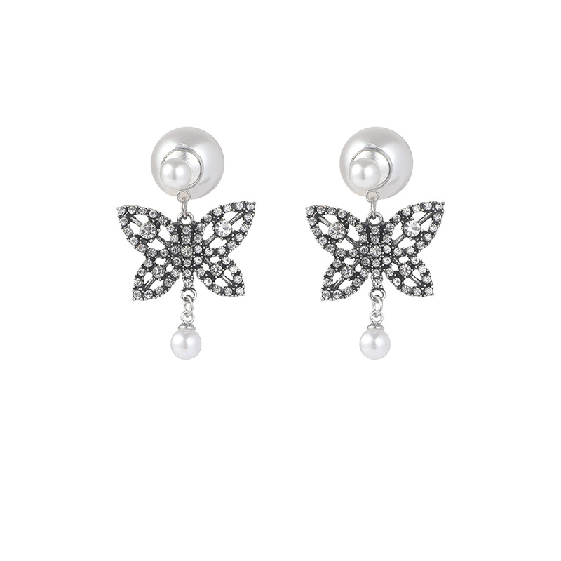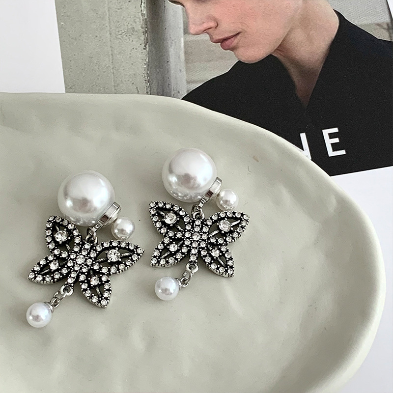 复古做旧镂空金属蝴蝶珍珠耳环气质高级双面球耳钉年新款耳饰