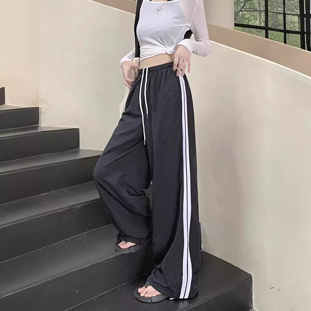 美式撞色两条杆速干阔腿裤女夏季新款高腰宽松显瘦拖地休闲裤