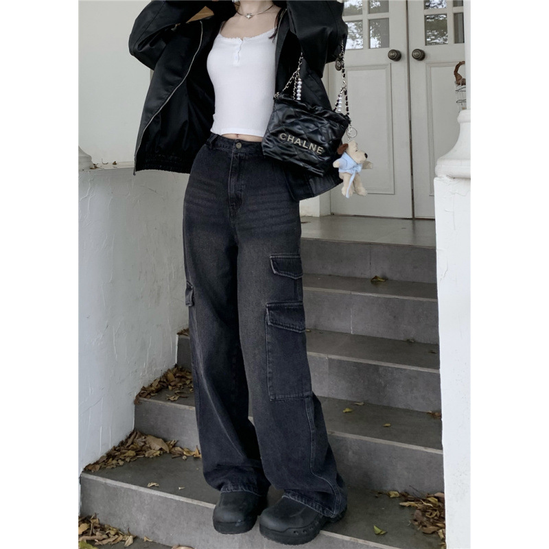 复古做旧牛仔裤高腰工装裤女垂感直筒裤长裤子女