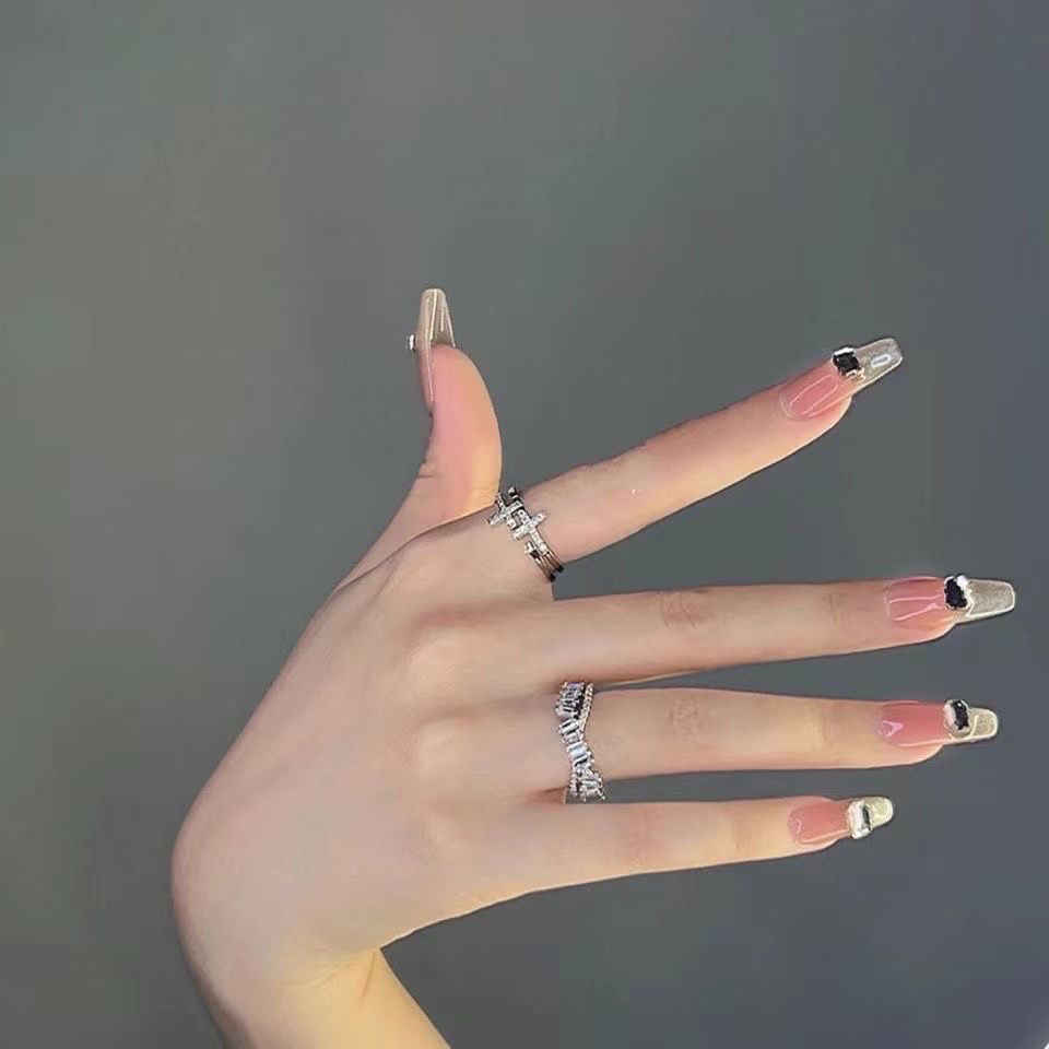手工美甲穿戴甲假指甲贴片美甲成品黑色爆闪钻四芒星晕染短款学生