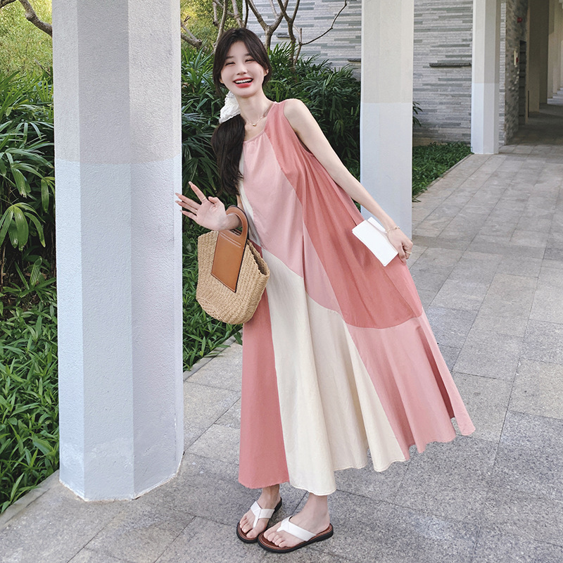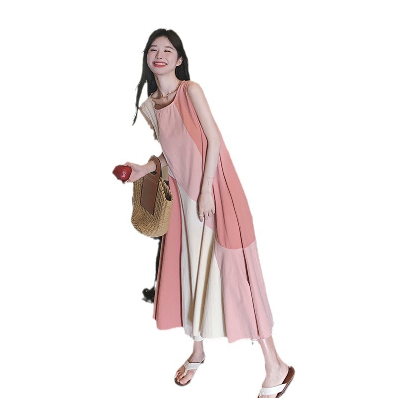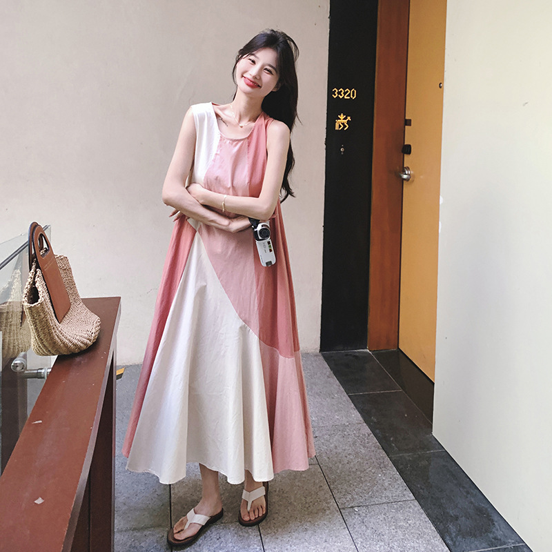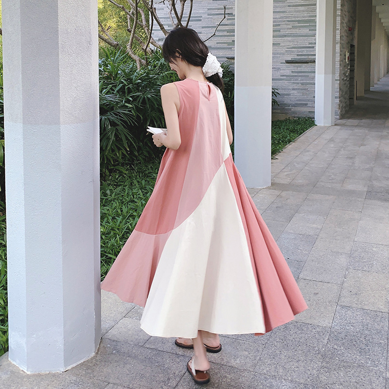 甜美时尚粉色无袖连衣裙女夏季新款度假感大裙摆设计背心裙子
