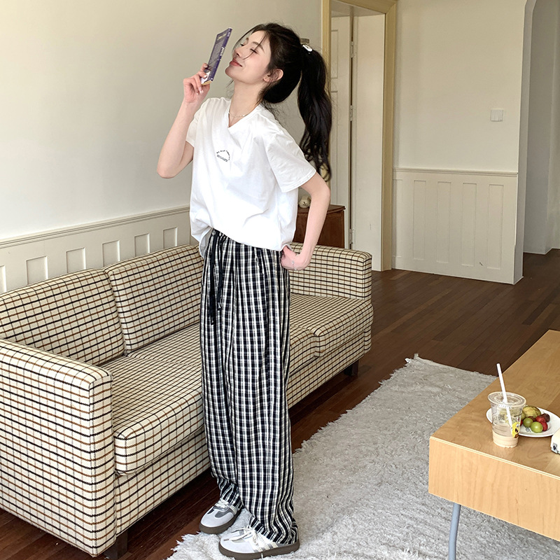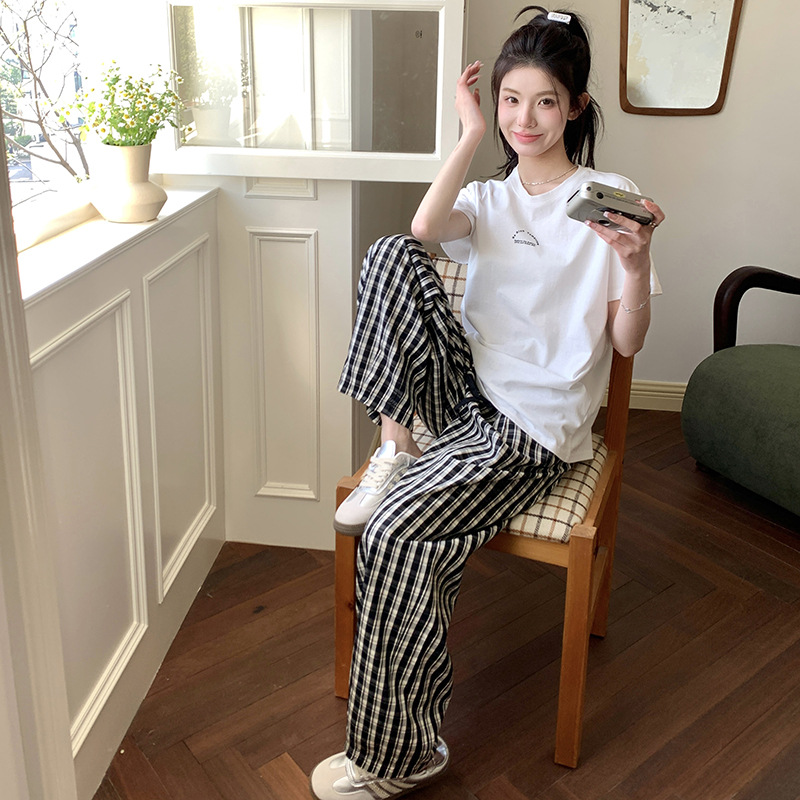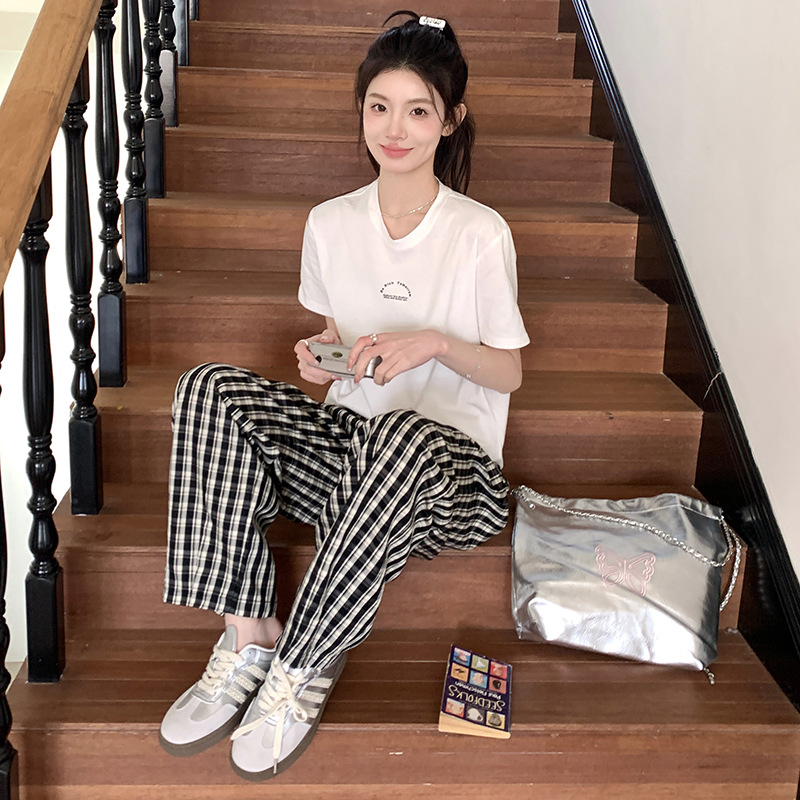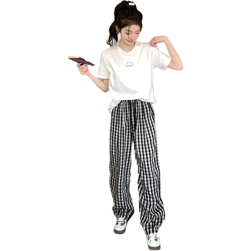 元气少女简约圆领字母印花休闲短款T恤宽松抽绳格子长裤两件套装