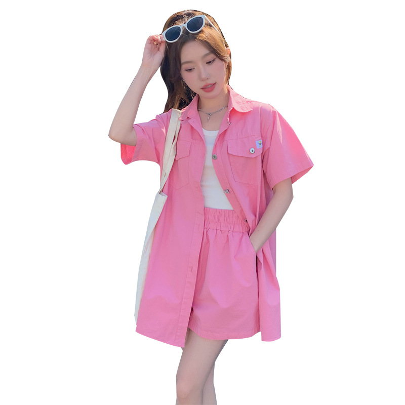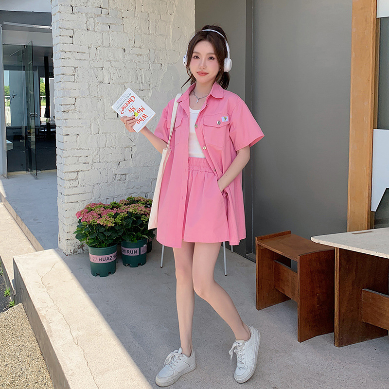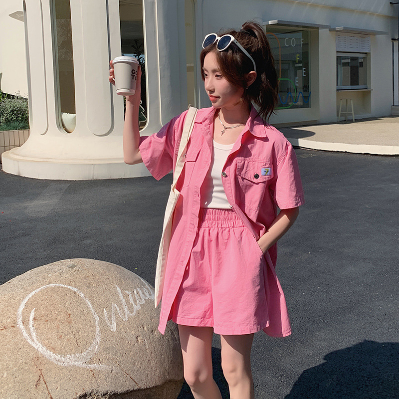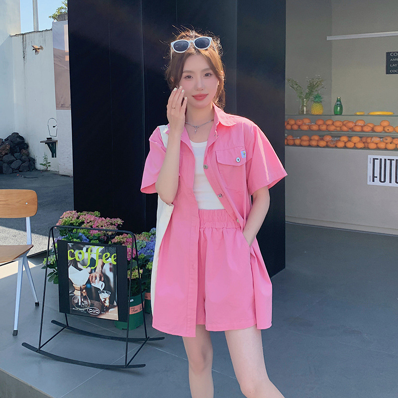 粉色衬衫套装女夏季新款多巴胺穿搭时尚休闲小个子短裤两件套