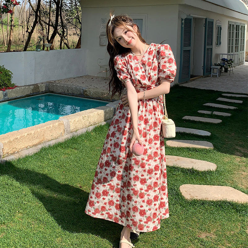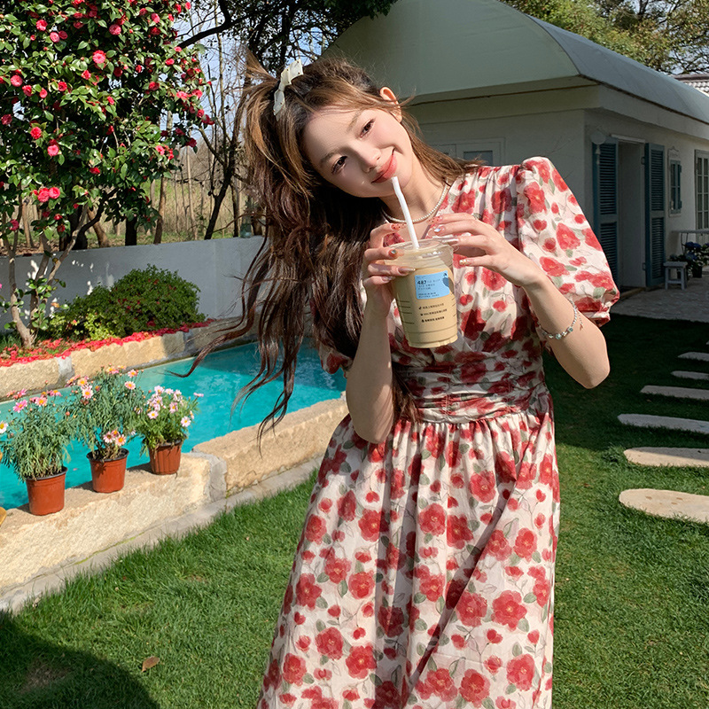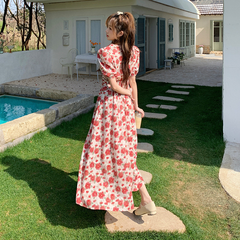 小清新印花连衣裙夏季收腰新款法式显瘦气质休闲裙子碎花长裙