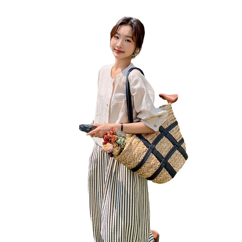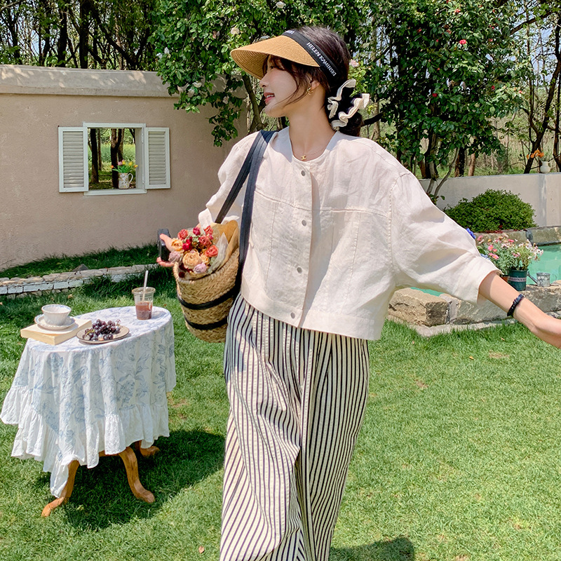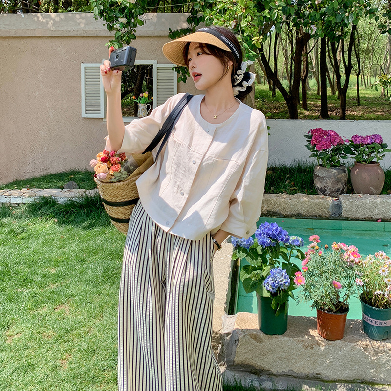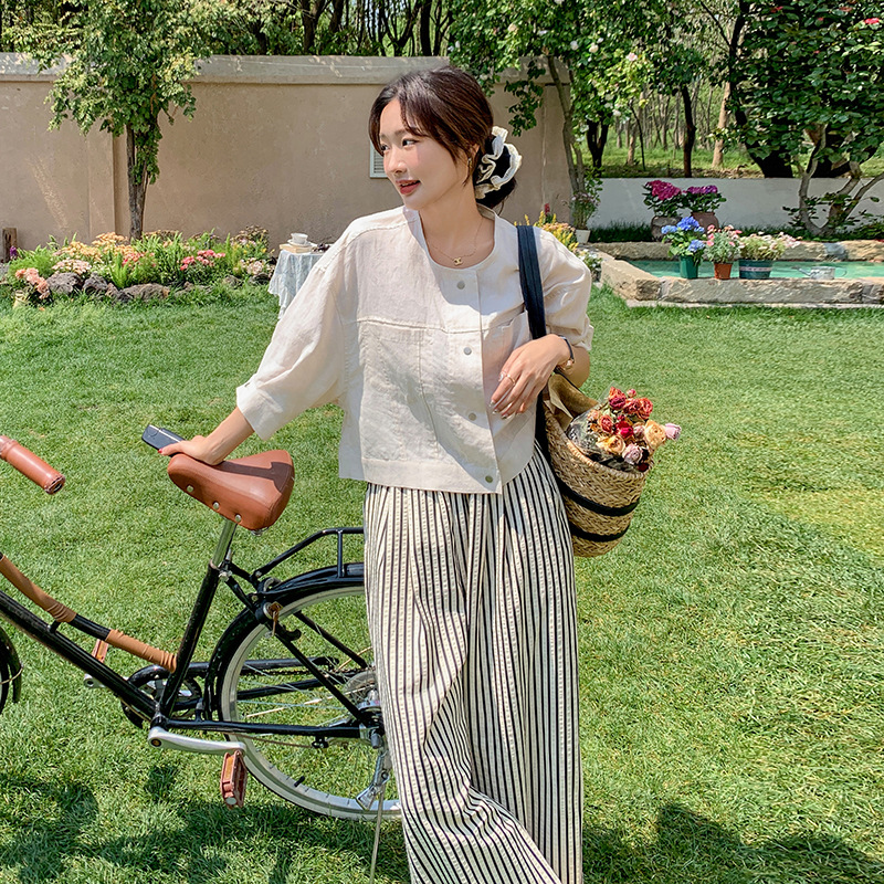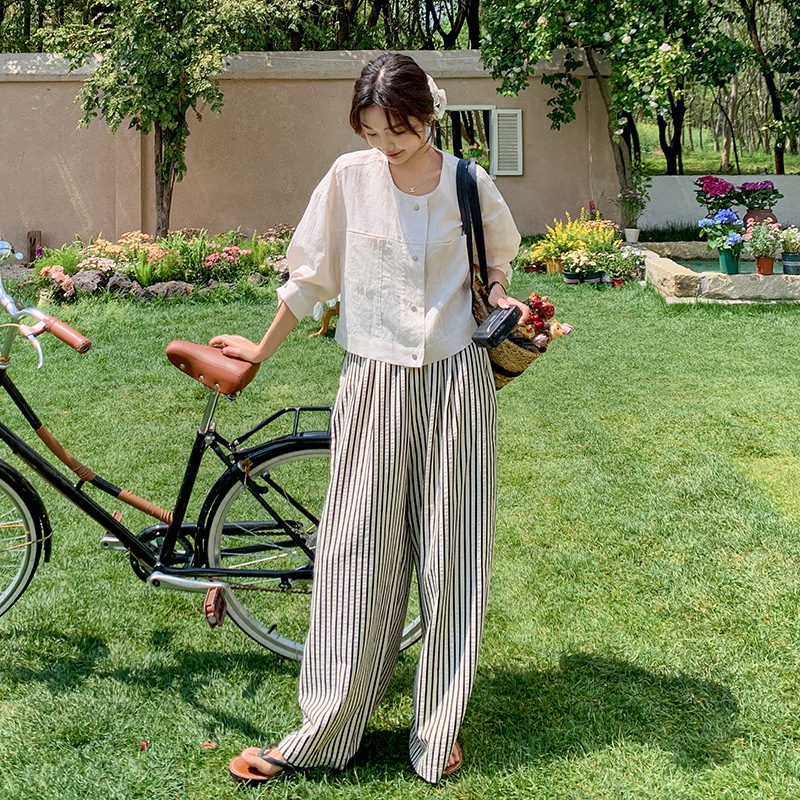 白色衬衫条纹阔腿裤套装夏新款一整套宽松透气休闲气质两件套