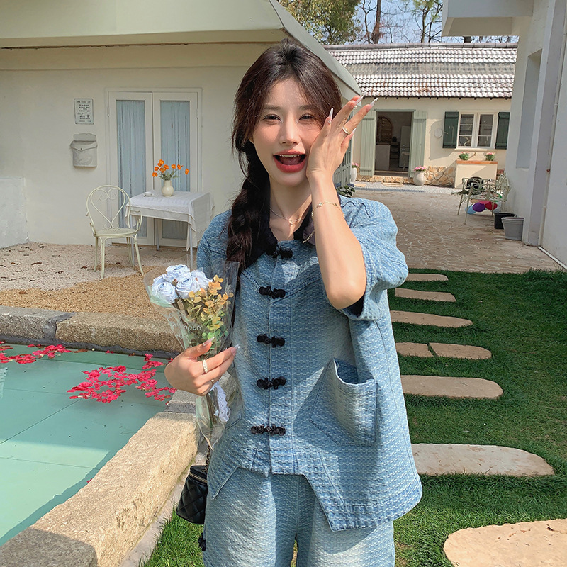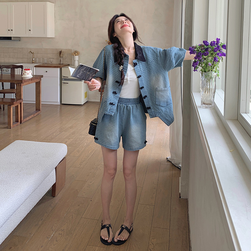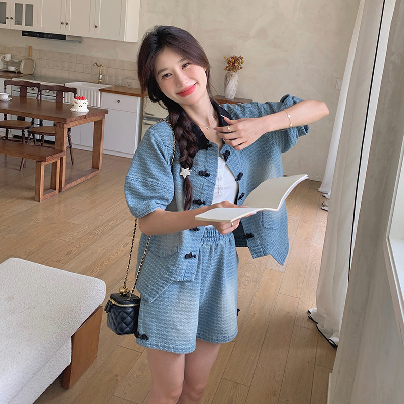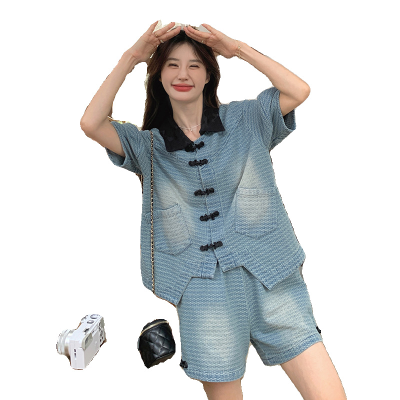 可盐可甜小个子牛仔套装女夏季新款国风新中式上衣短裤两件套