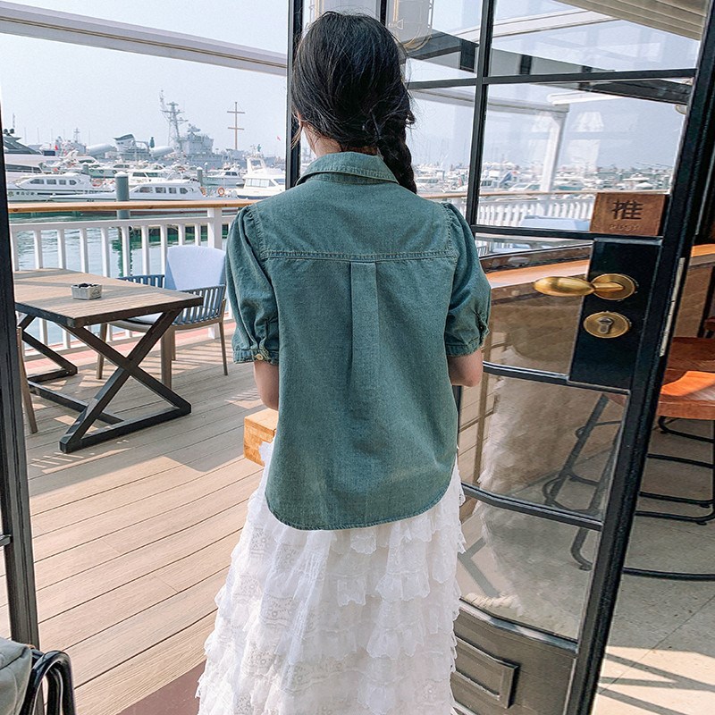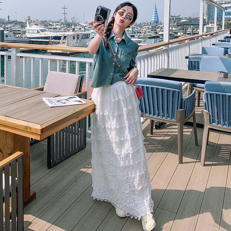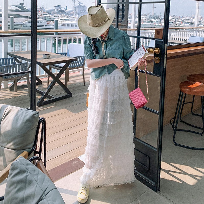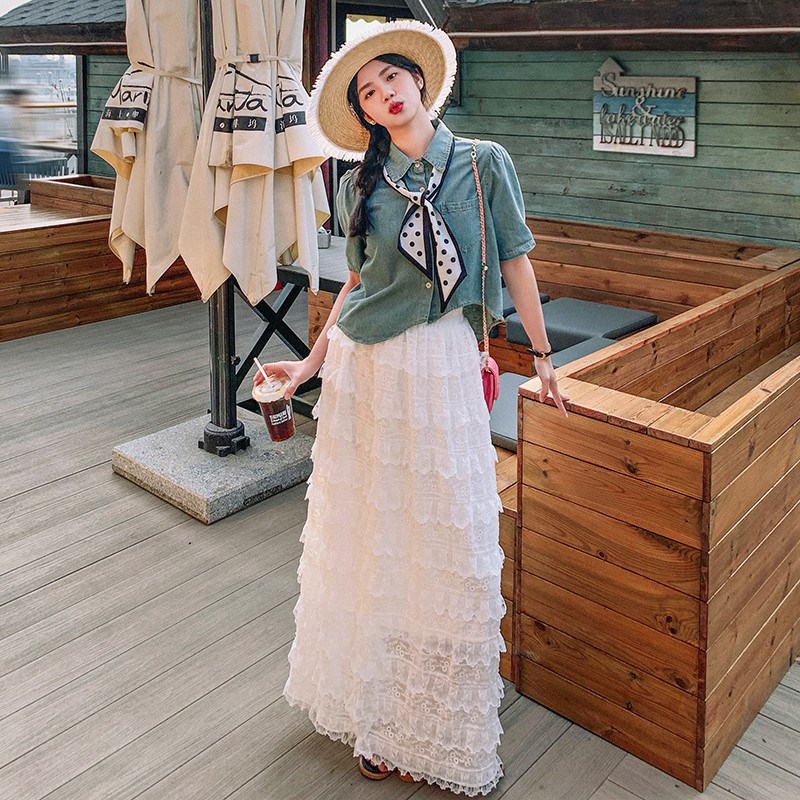 新款时尚丝巾牛仔短袖套装女夏季立体感蕾丝蛋糕半身裙两件套