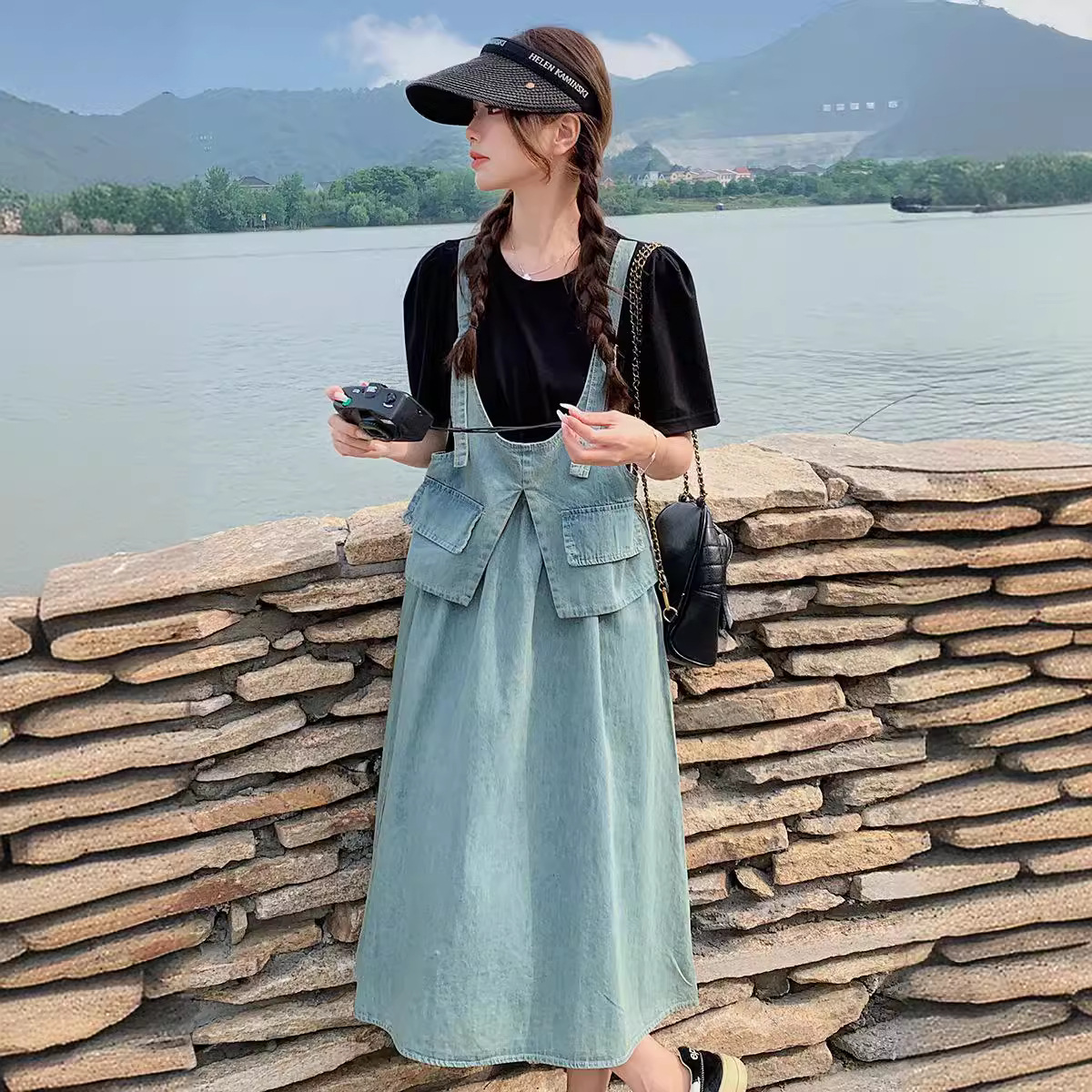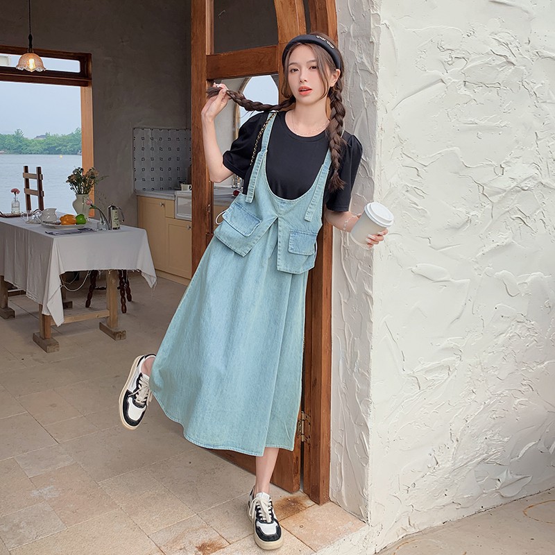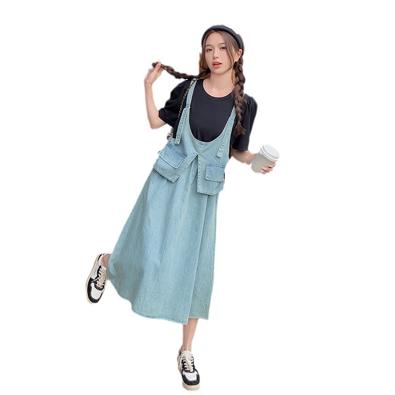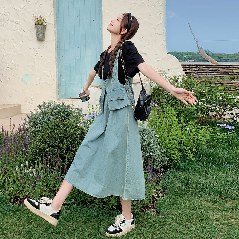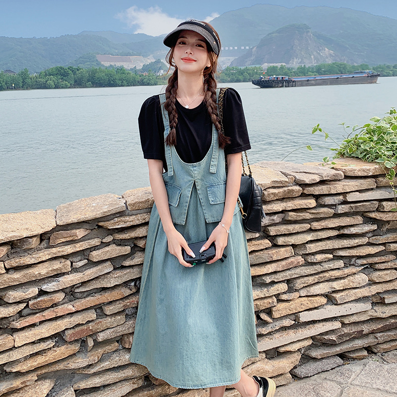 经典复古薄款针织拼接牛仔假两件连衣裙夏新款时髦街头休闲中长裙