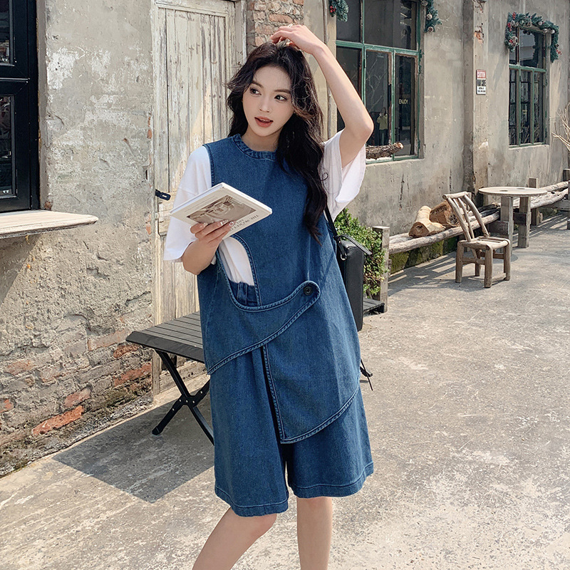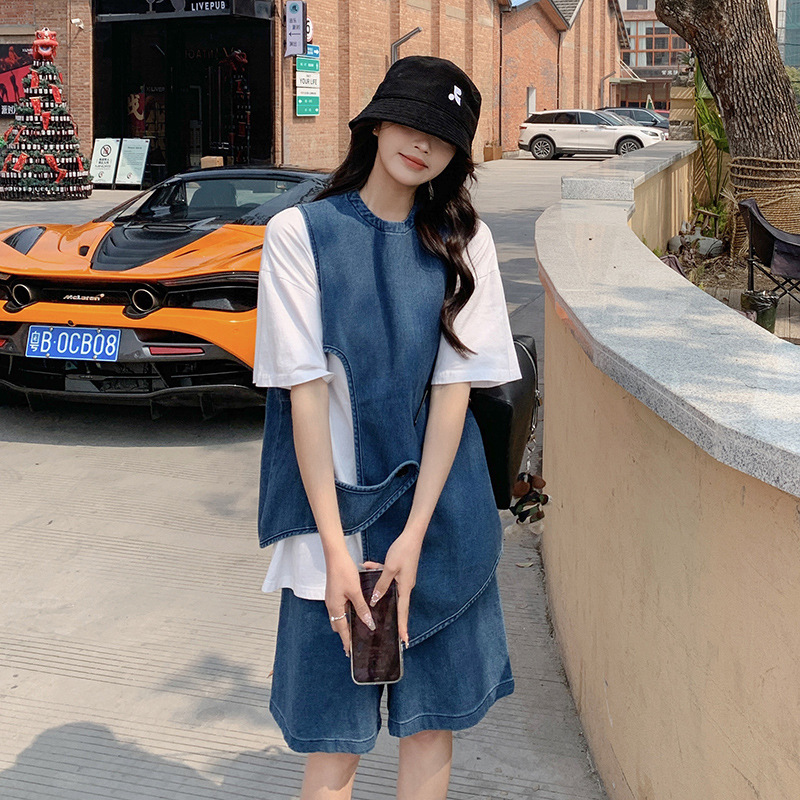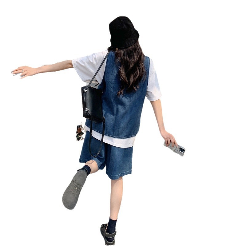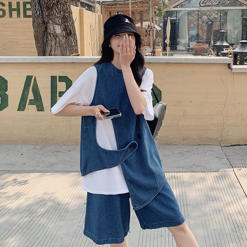 夏新款设计感洋气时尚百搭短上衣高腰阔腿裤水洗牛仔两件套装