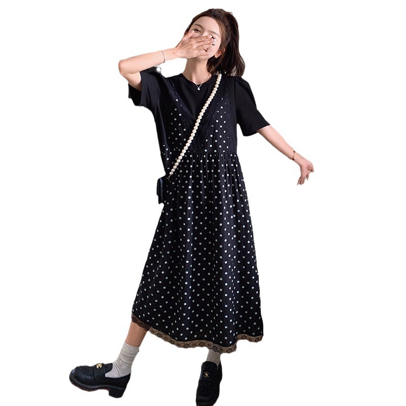 法式甜美假两件波点连衣裙夏清新减龄撞色圆领宽松蕾丝拼接少女裙