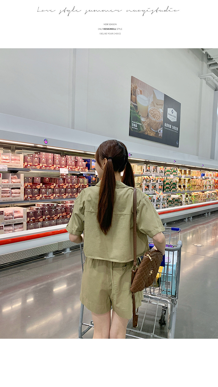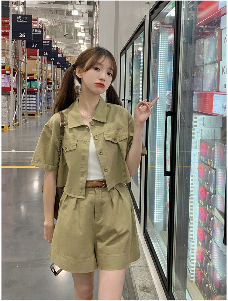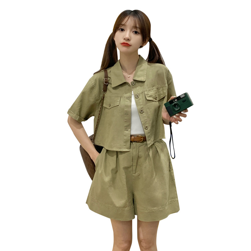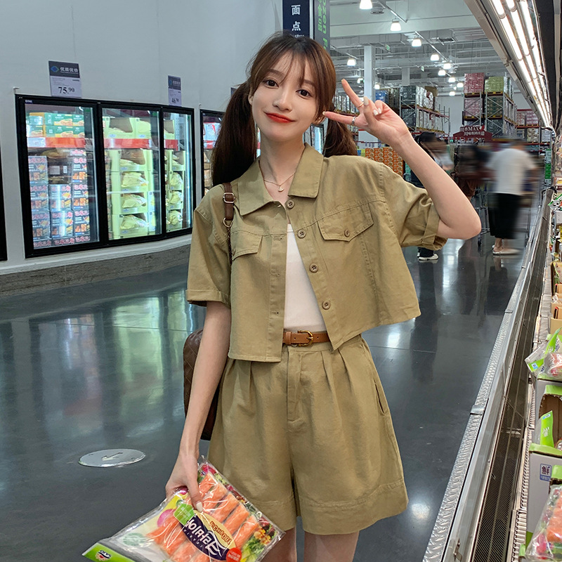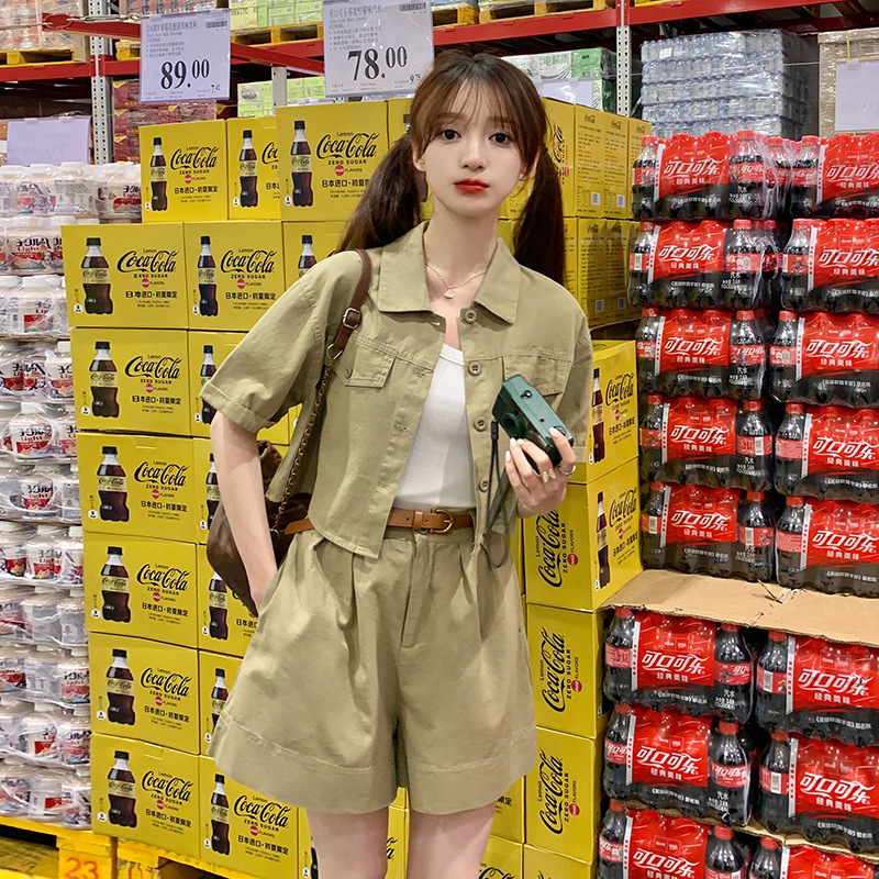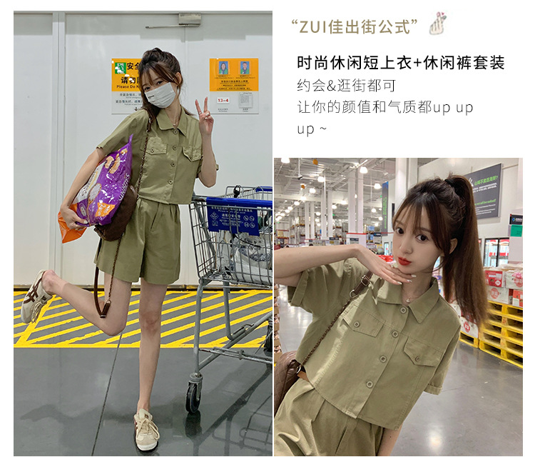 时尚运动套装女夏季个性翻领气质短款上衣高腰直筒宽松短裤两件套