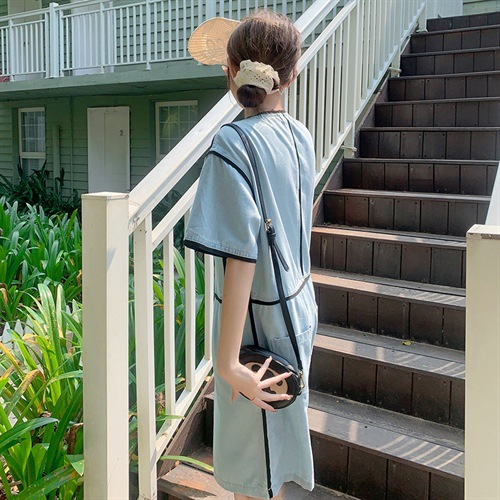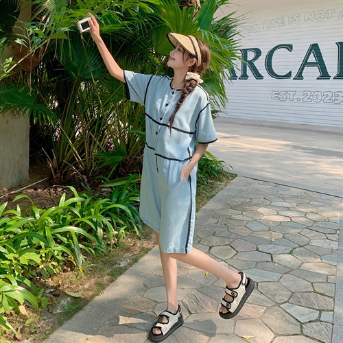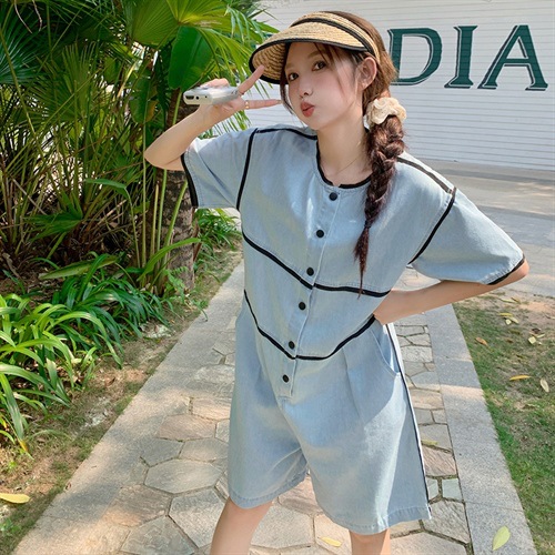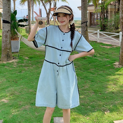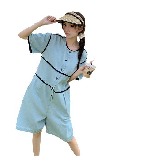时尚炸街牛仔连体裤夏季潮流时尚宽松撞色包边拼接圆领直版休闲裤