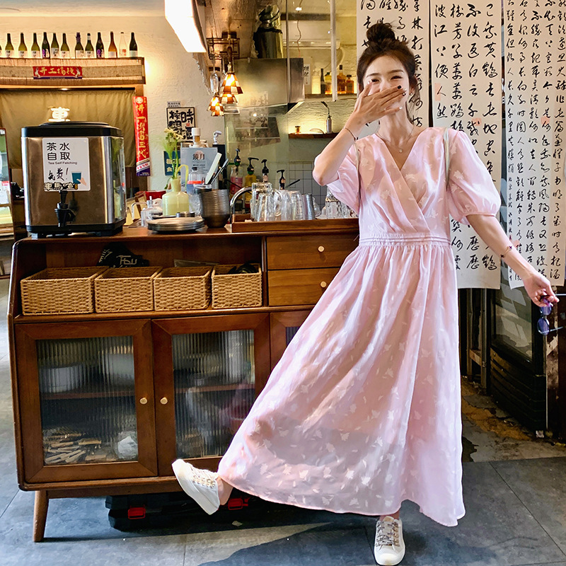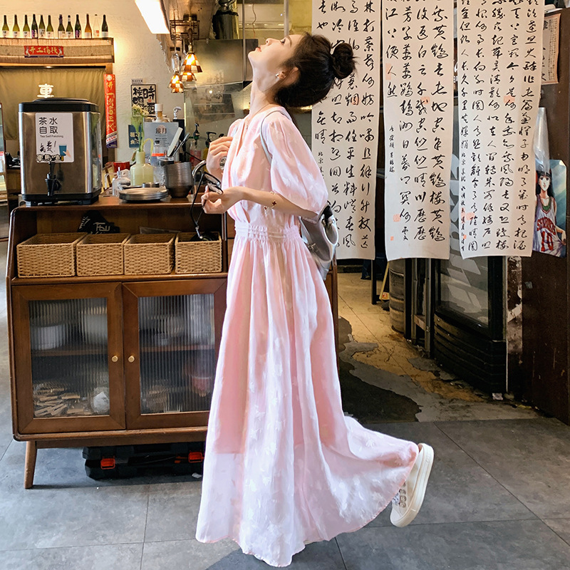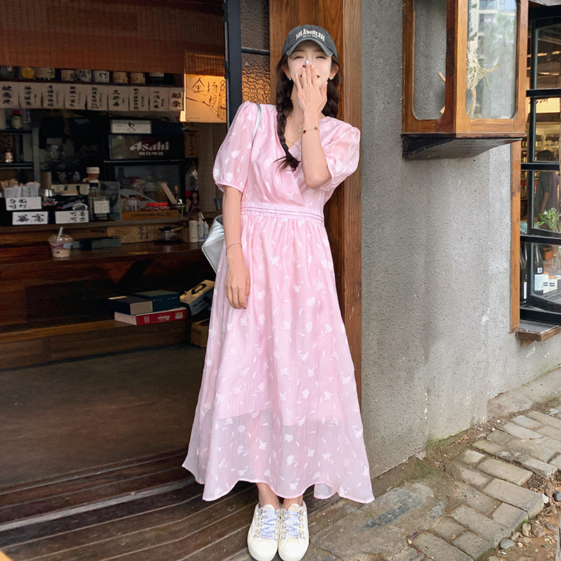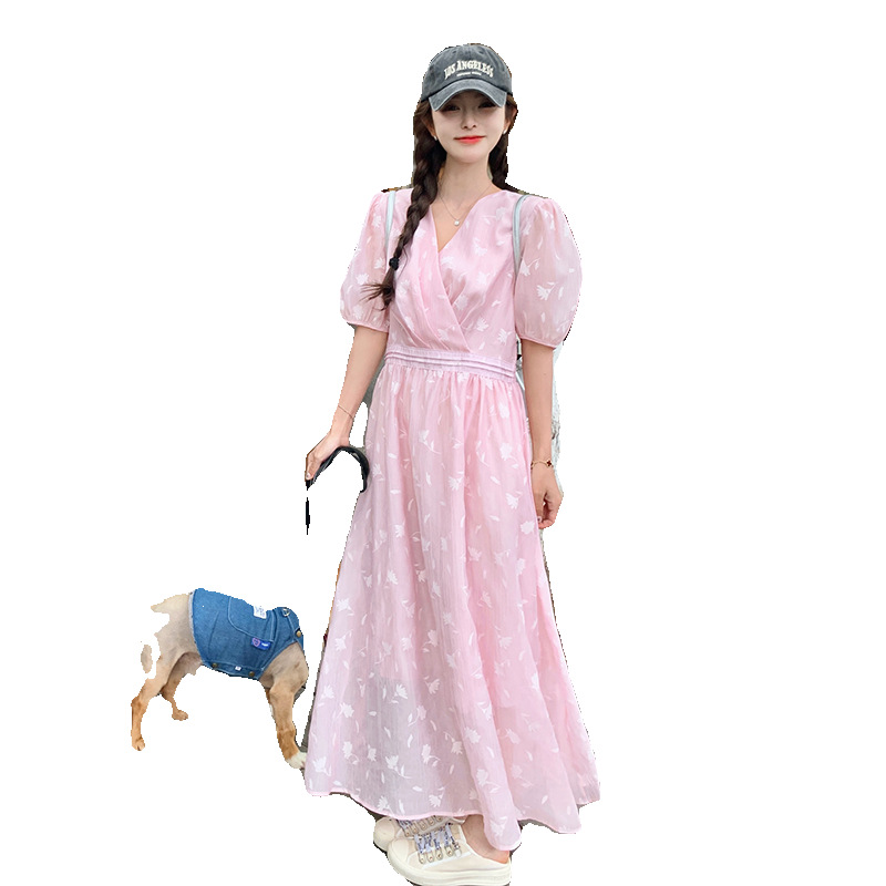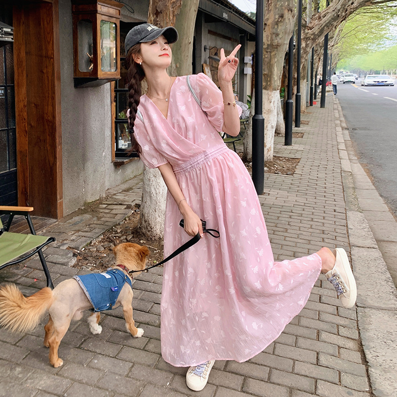 法式V领印花显瘦收腰连衣裙子甜美氛围感渡假风压皱碎花少女长裙