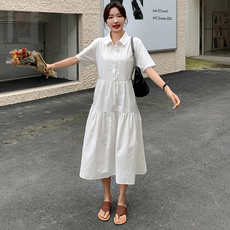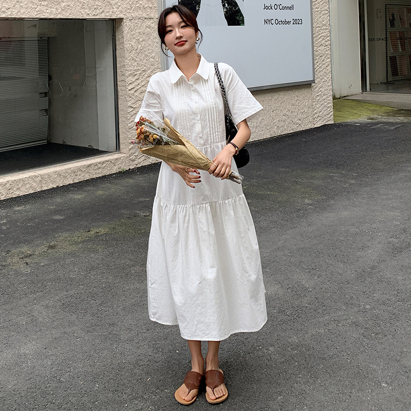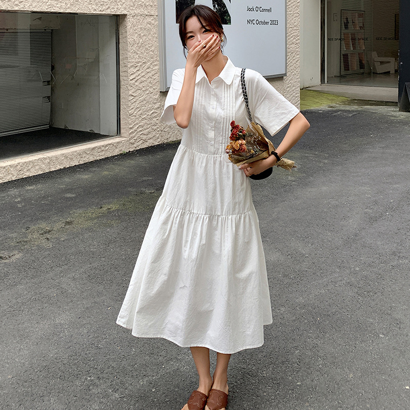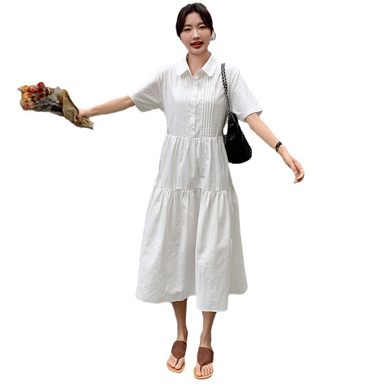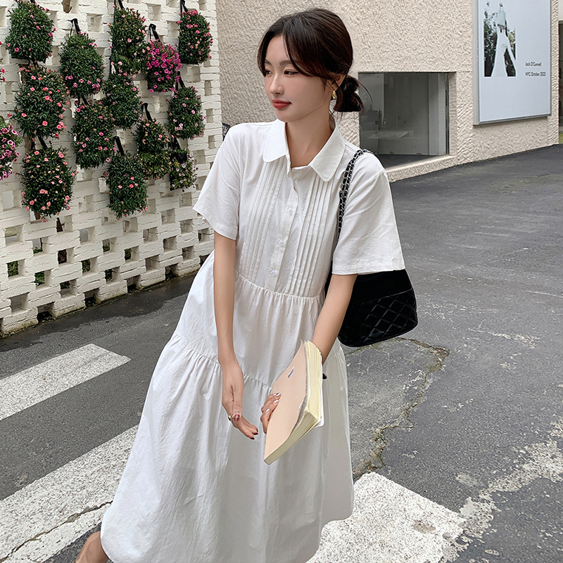 韩版宽松显瘦A字白色连衣裙夏季新品翻领短款褶皱拼接休闲裙