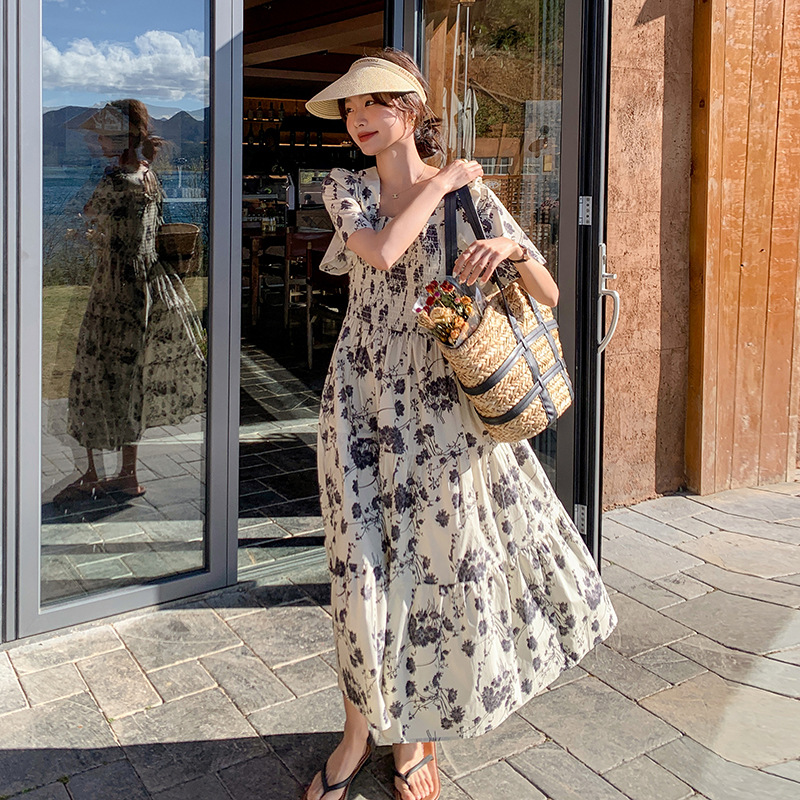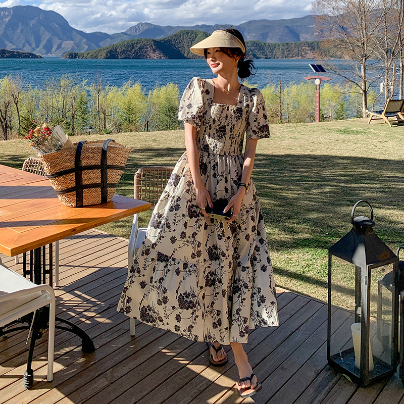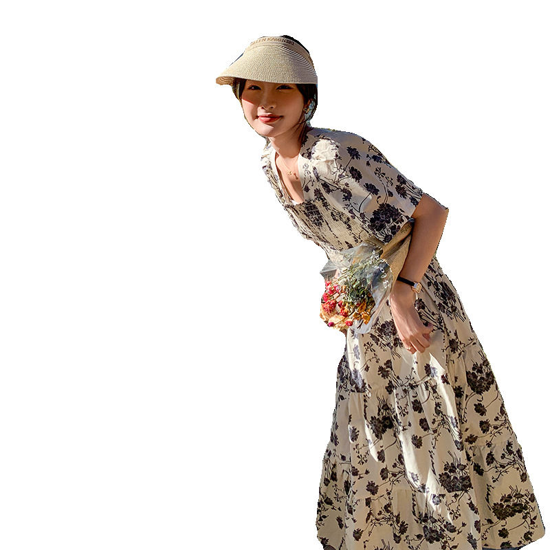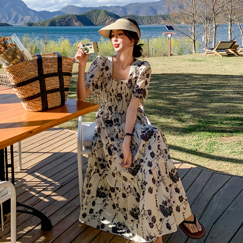法式甜美少女方领短袖碎花连衣裙褶皱收腰气质长裙休闲印花茶歇裙