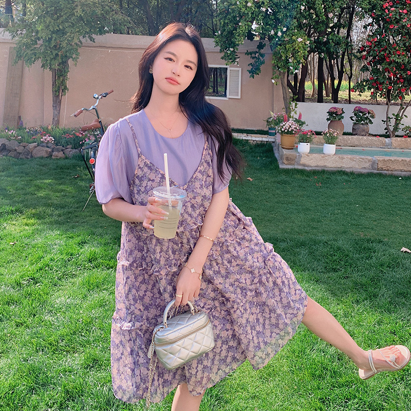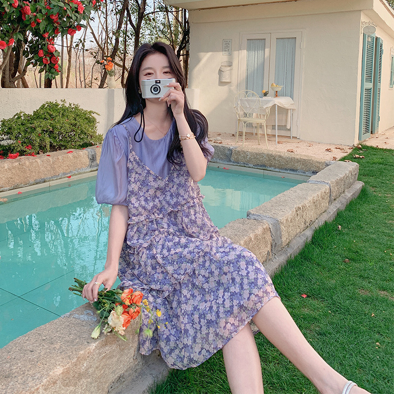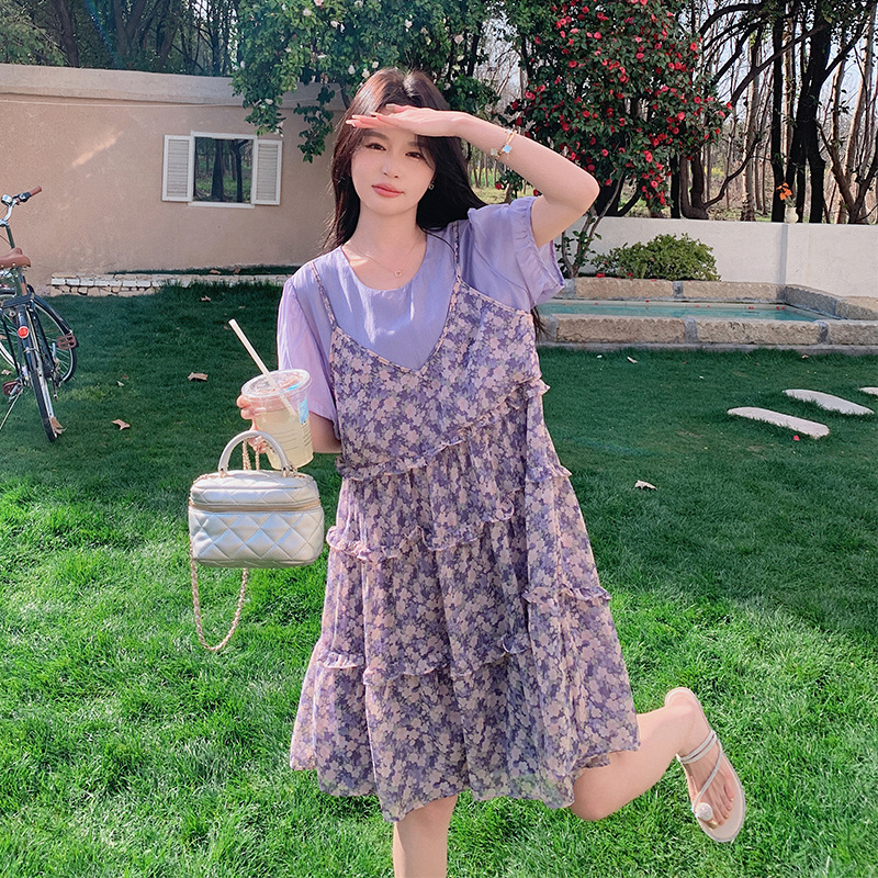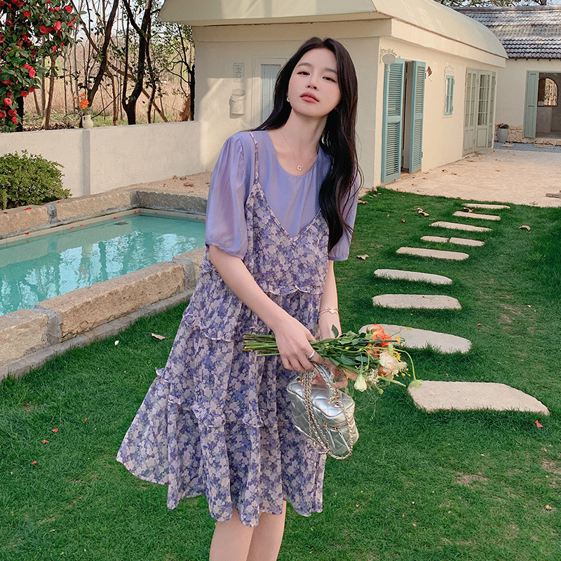 夏季新款小个子宽松显瘦碎花娃娃裙时尚休闲假两件印花连衣裙