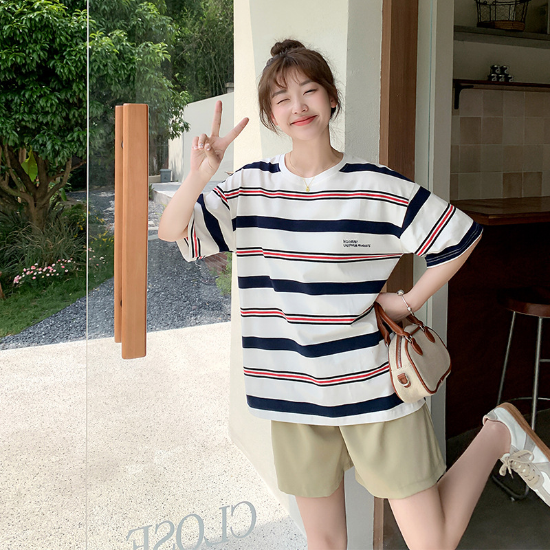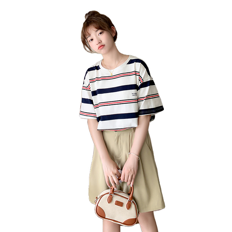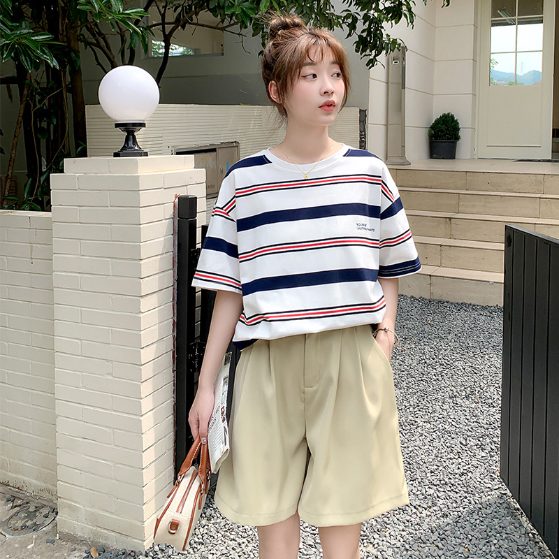 夏新款小众休闲运动套装简约落肩条纹T恤上衣宽松短裤两件套